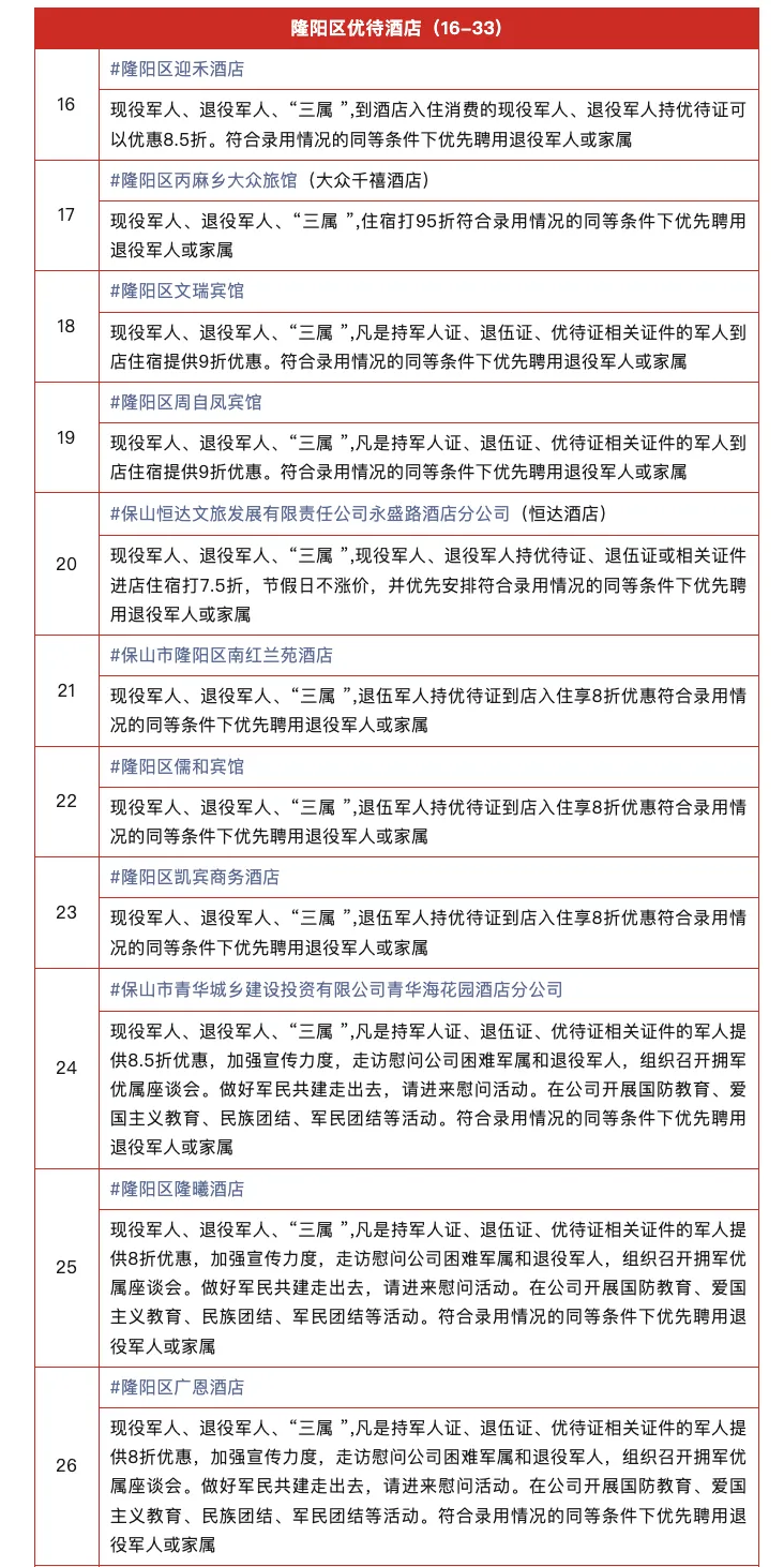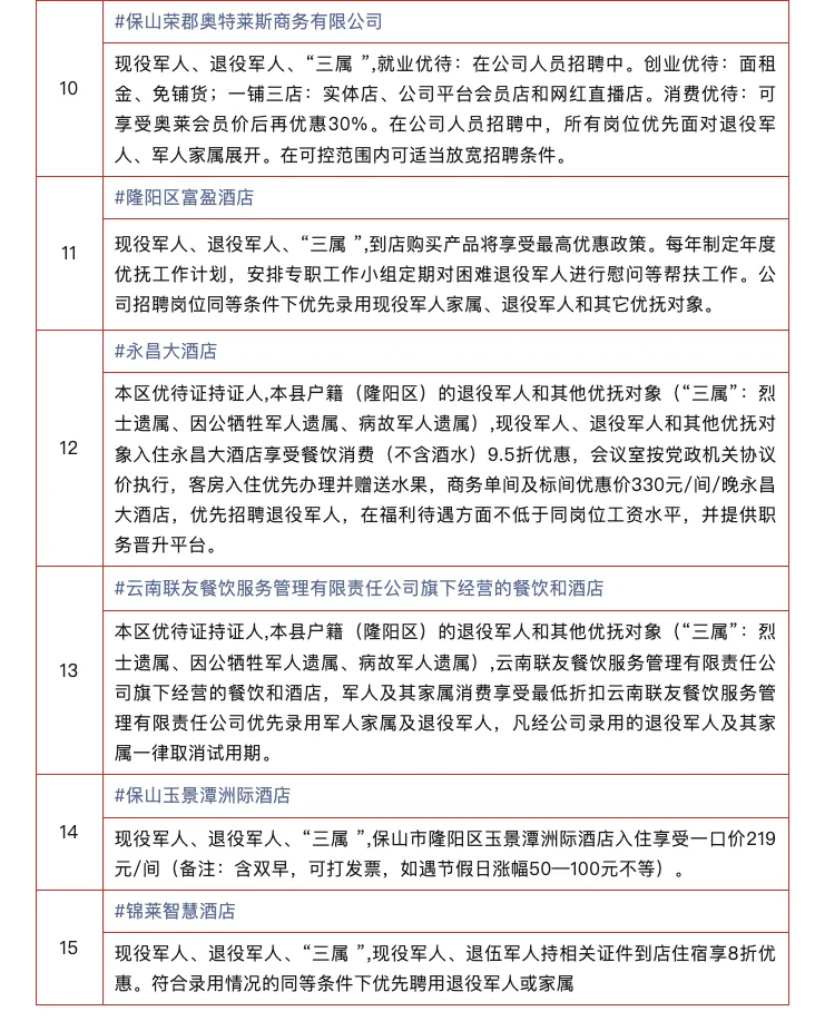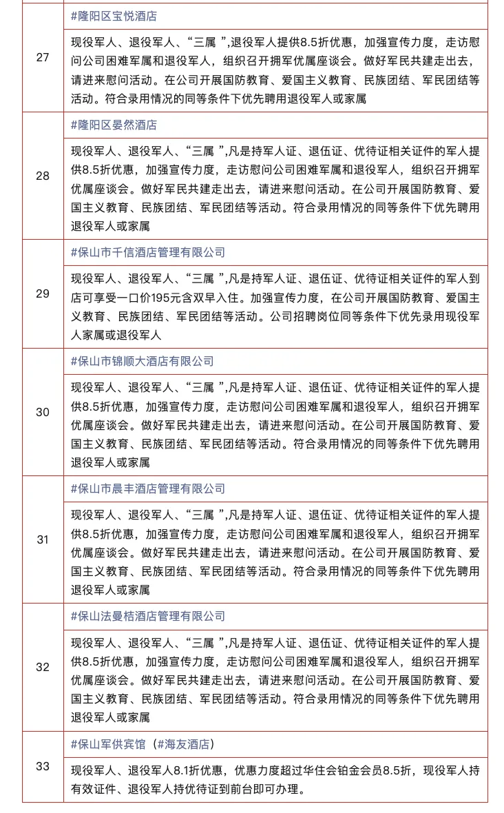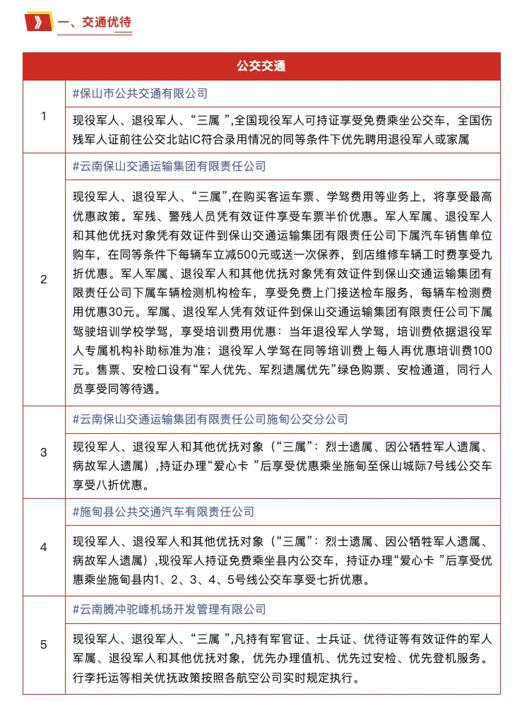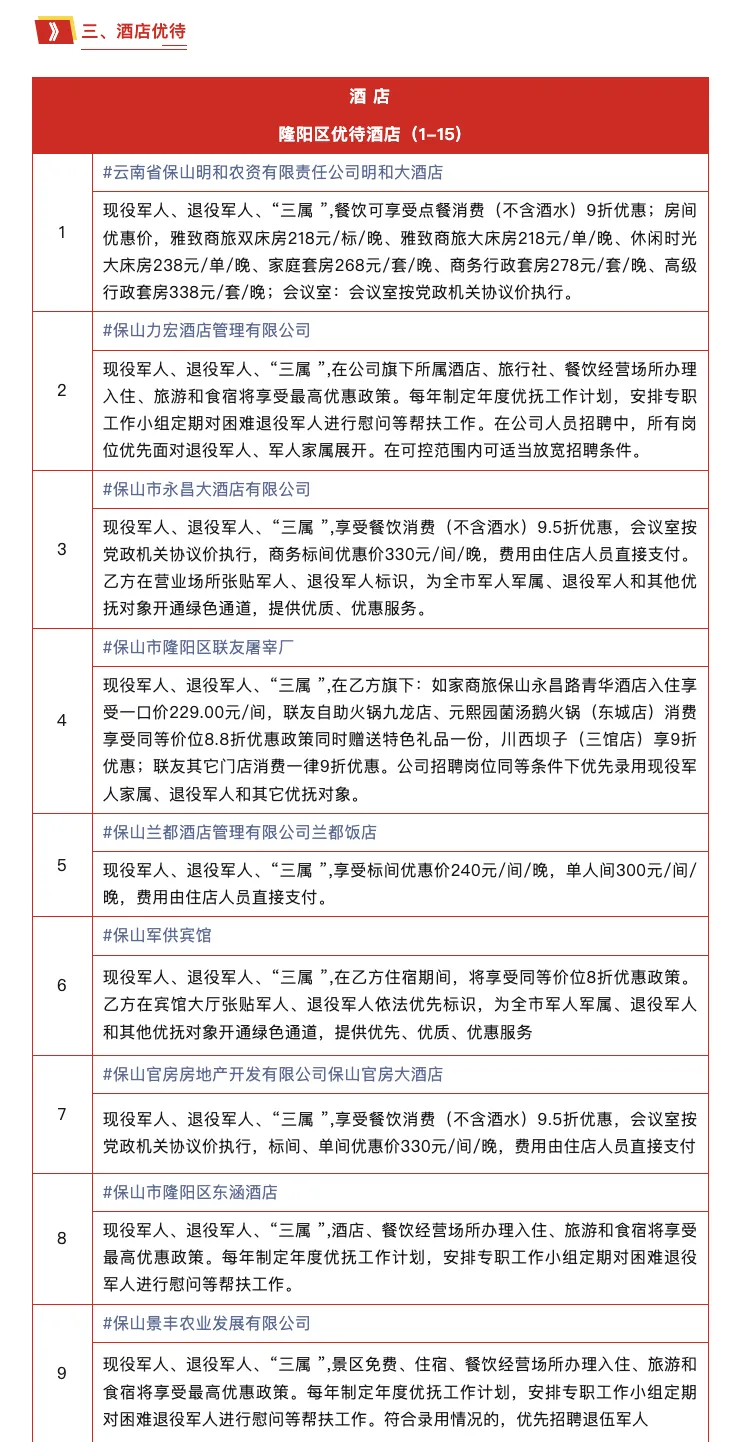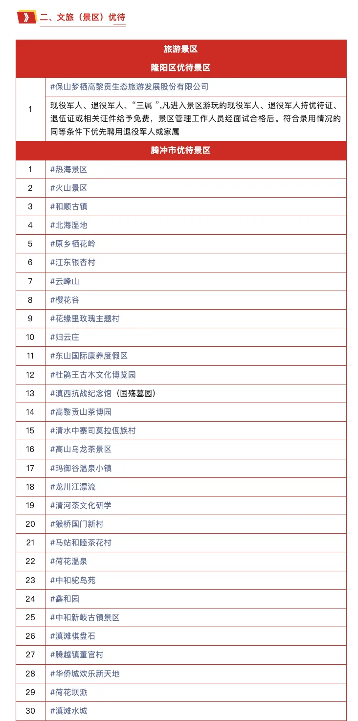 在保山市 保山市退役军人事务局 公布交通、文旅、酒店 三大领域的专属优待 现役军人、退役军人及 “三属” 凭有效证件 可享景区免门票 住宿最低8折 涵盖多样房型 餐饮最低8折等优惠