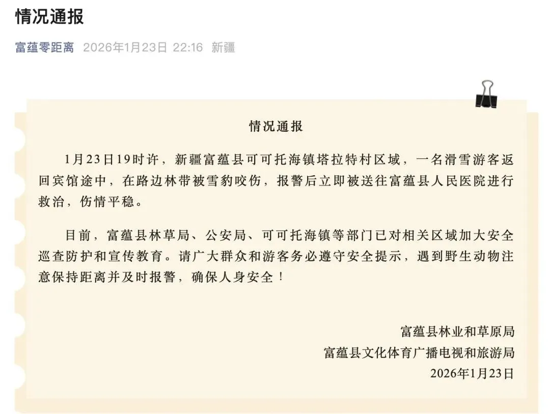1月23日晚,新疆富蕴县林业和草原局、富蕴县文化体育广播电视和旅游局发布通报:23日19时许,新疆富蕴县可可托海镇塔拉特村区域,一名滑雪游客返回宾馆途中,在路边林带被雪豹咬伤,报警后立即被送往富蕴县人民医院进行救治,伤情平稳。