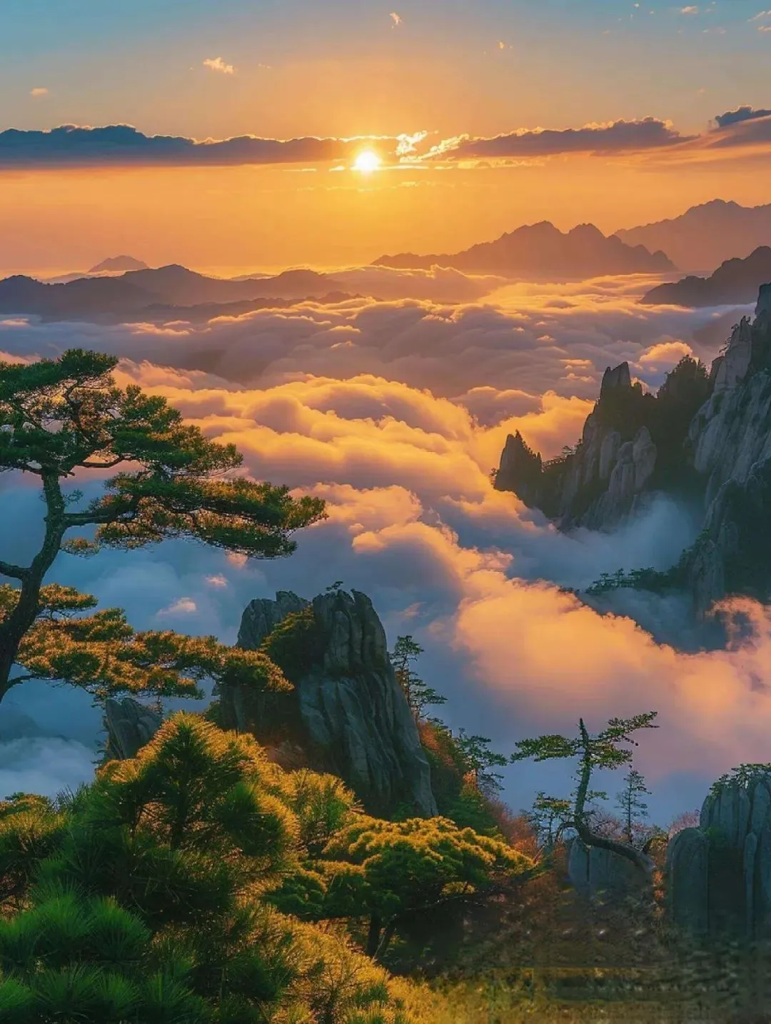站在始.信峰边上,.看云从山谷.里漫.上.来,.吞掉那.些怪石,就剩几棵松.树.的尖.尖露在外面。.山顶的床位.紧.张,裹着租来.的军大衣等.日出,风吹得人哆.嗦,但太阳跳出来的那一.刻,没人说话。