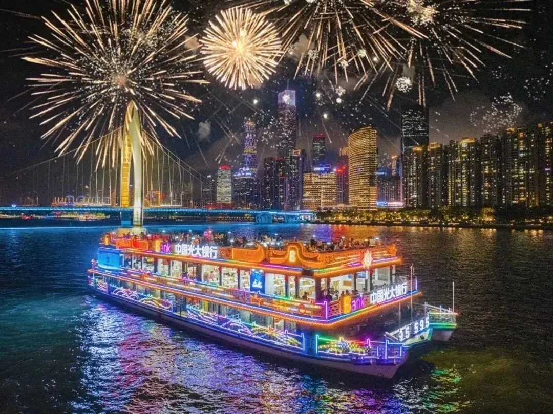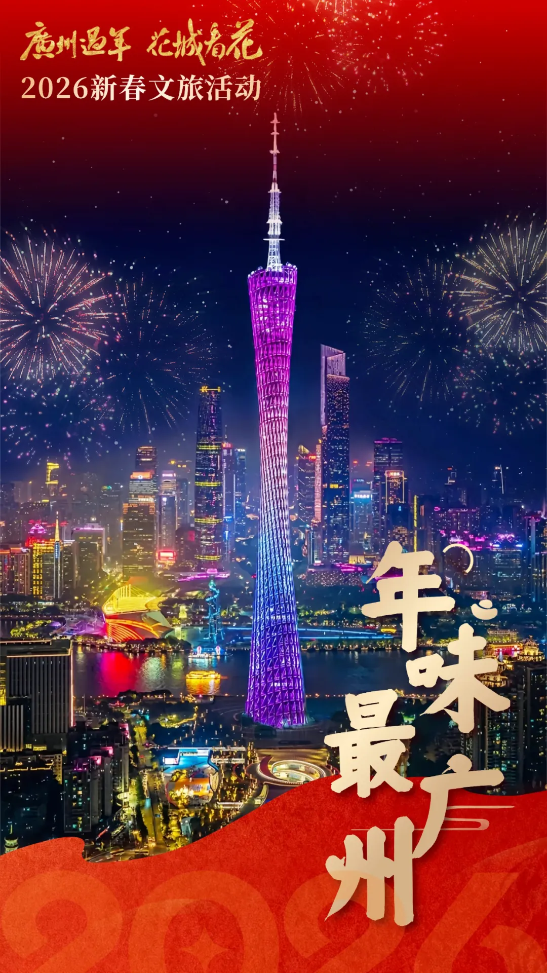 “最受大家期待的重磅活动春节烟花汇演将于2月17日大年初一晚在白鹅潭震撼上演。高空烟花与无人机表演的精心设计,打造45分钟视听盛宴。届时,珠江沿岸观景平台与美食游船联动,为市民游客呈现‘东风夜放花千树,更吹落、星如雨’的花城新年浪漫景象。”