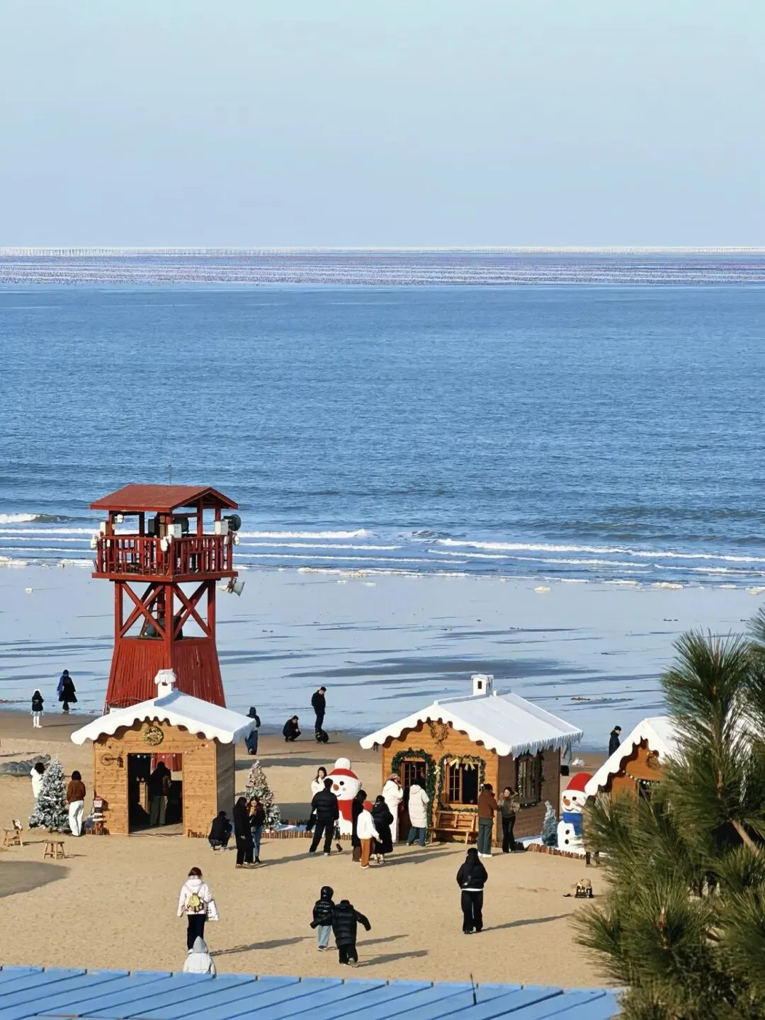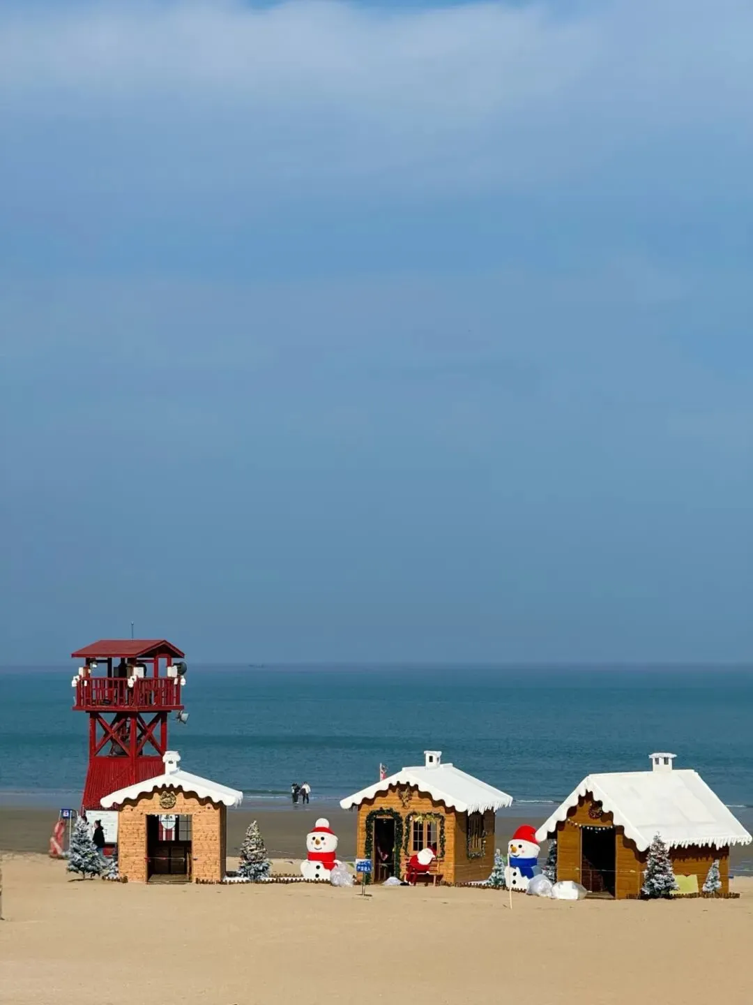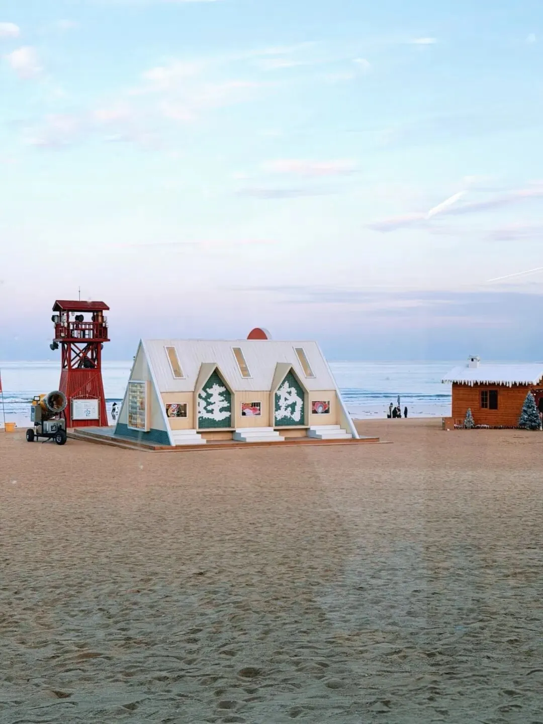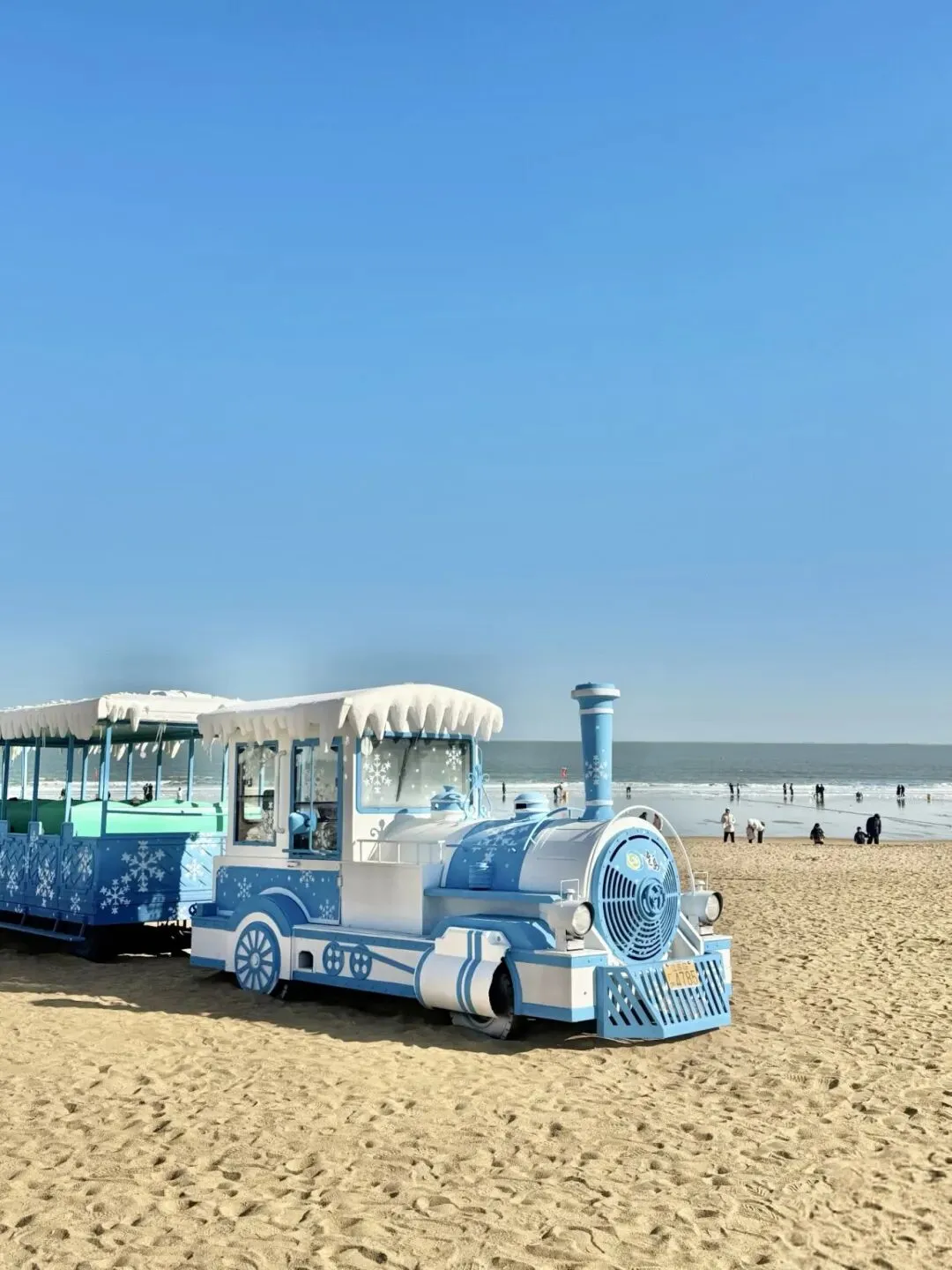 沙滩中央的蓝白色小火车成为了新晋的网红打卡点位。