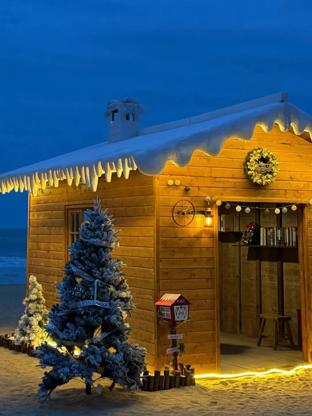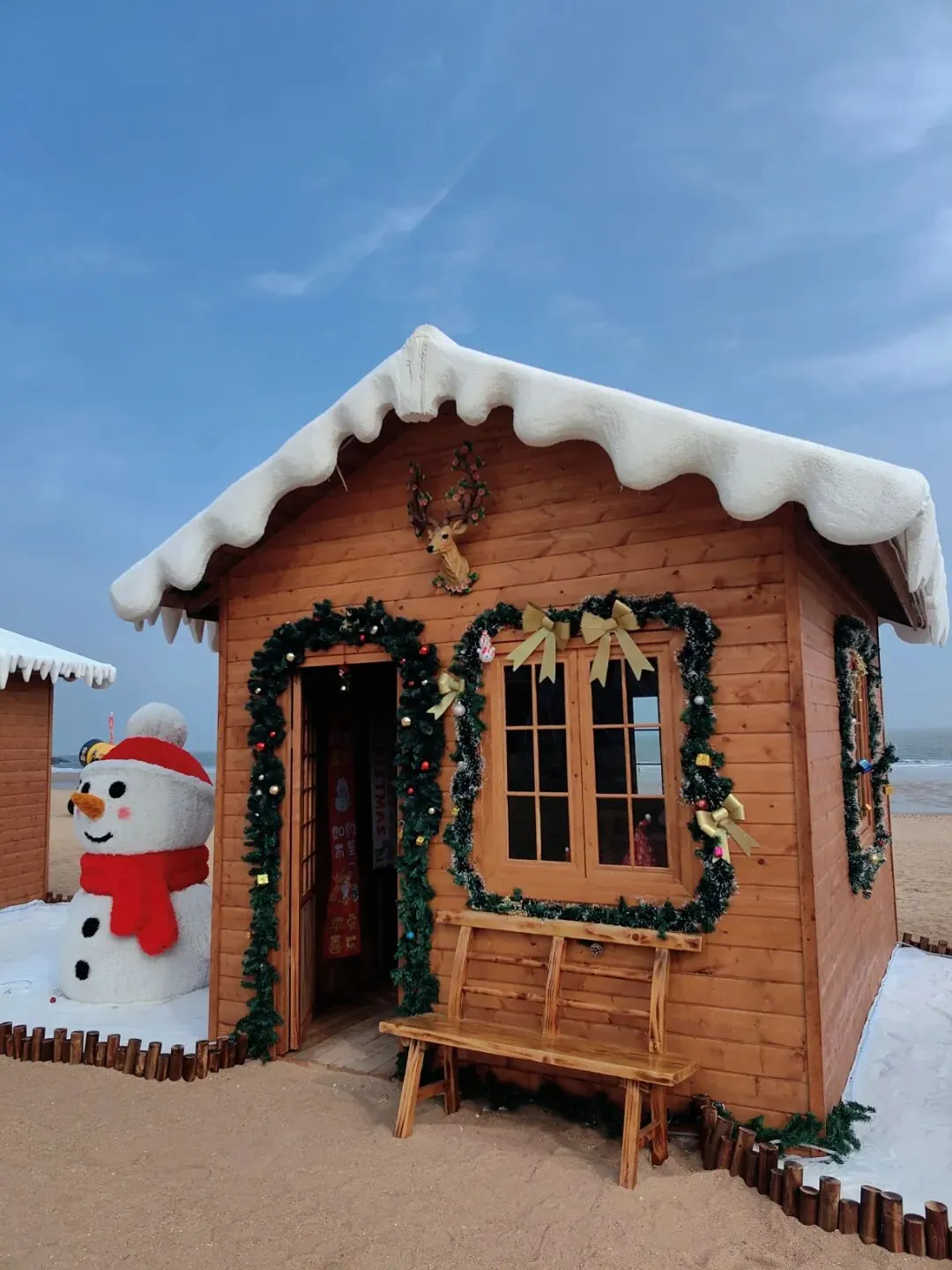另一座木屋的门楣与窗沿被松枝花环环绕,小鹿装饰与挂饰点缀其间,充满了生机与活力。坐在木屋前的长椅上,我们可以将沙滩与海景尽收眼底。