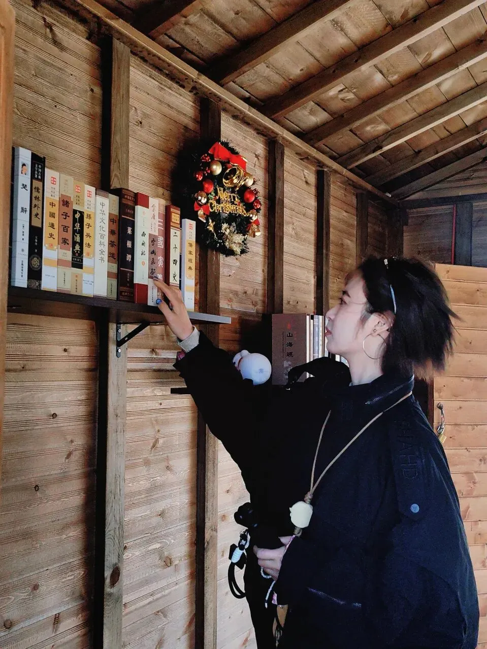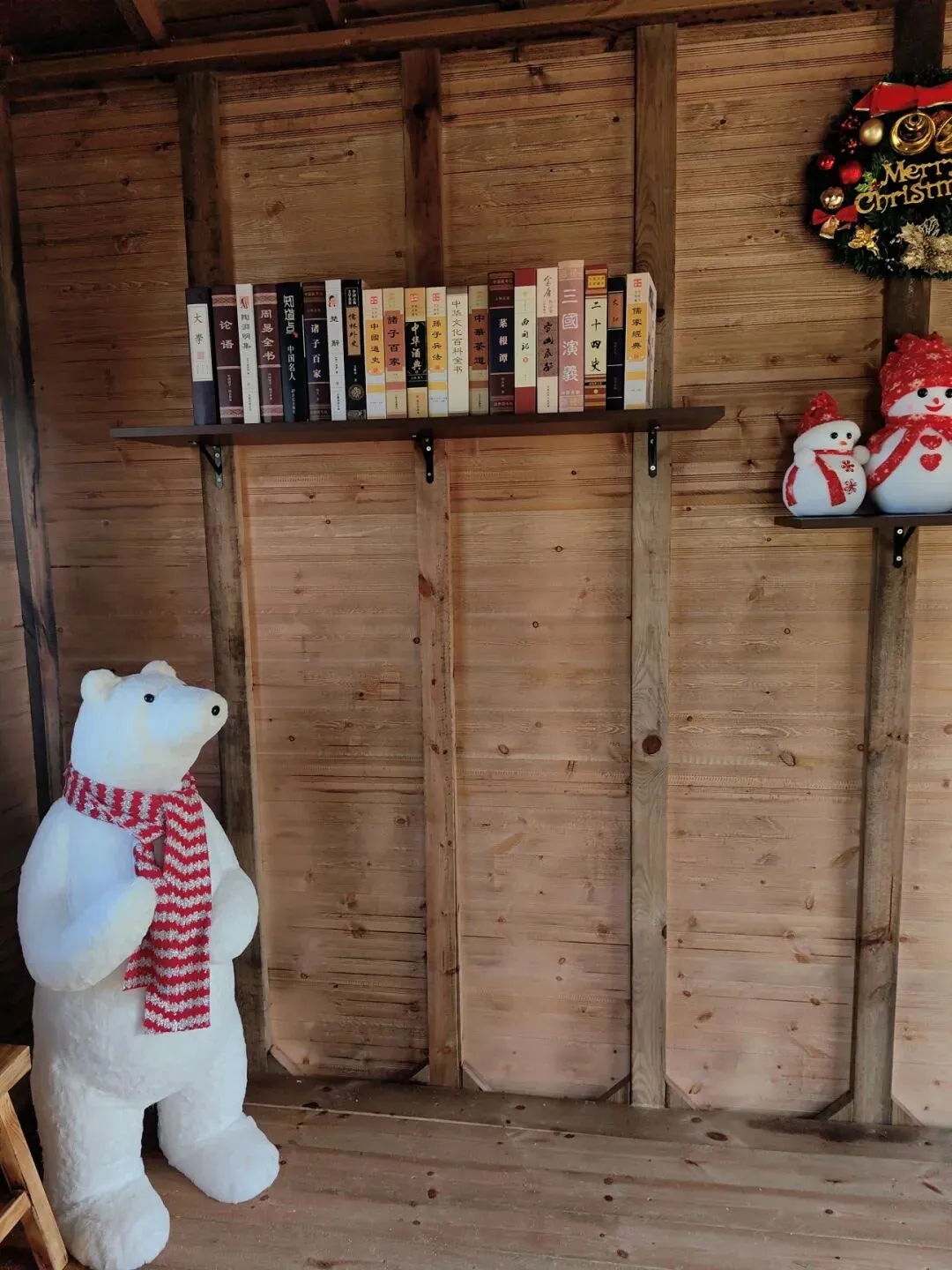 水晶雪球灯散发着柔和的光芒,红纹围巾的北极熊玩偶可爱至极,与摆满书籍的置物架相映成趣。