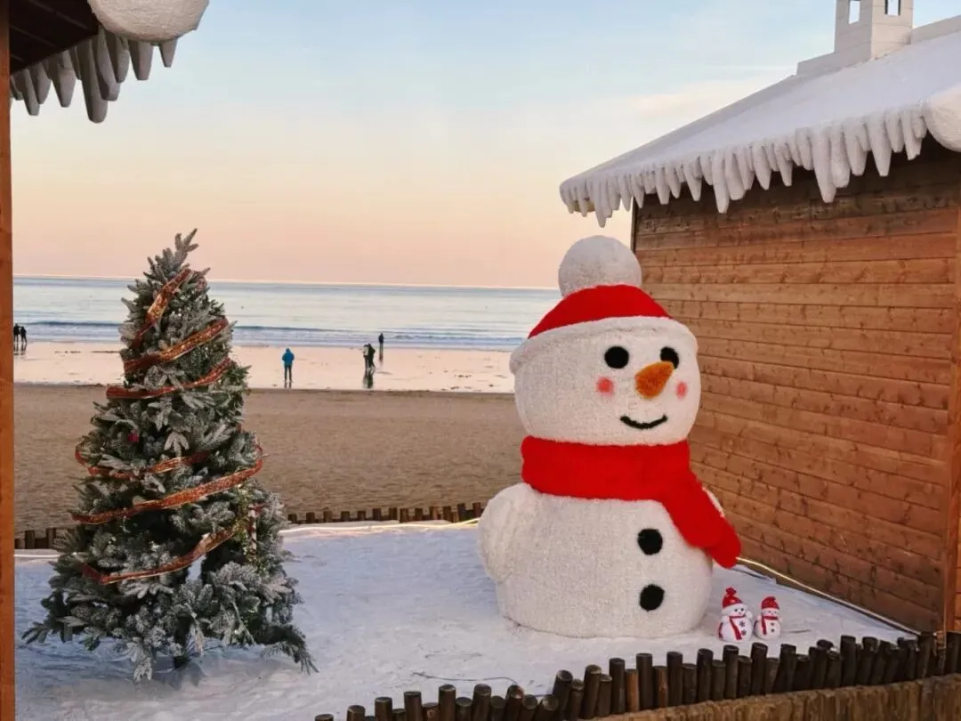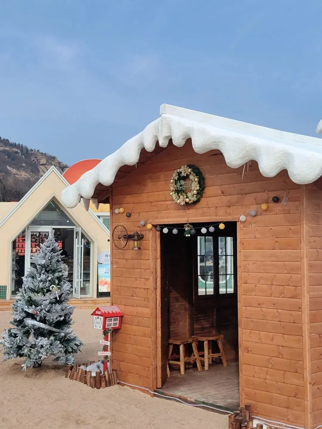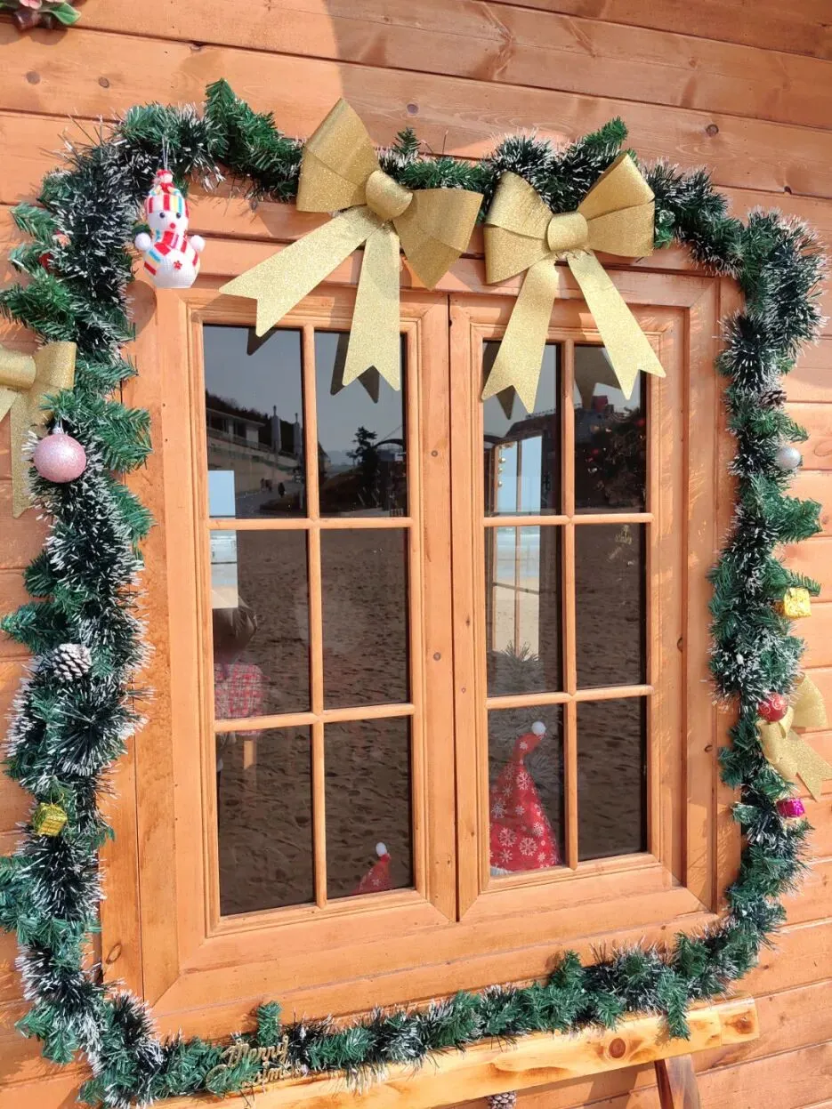 覆着仿真雪的屋顶垂挂着晶莹的冰棱,在阳光的照耀下折射出五彩的光芒。窗沿缠绕着绿松枝与金色蝴蝶结,增添了一份节日的氛围。
