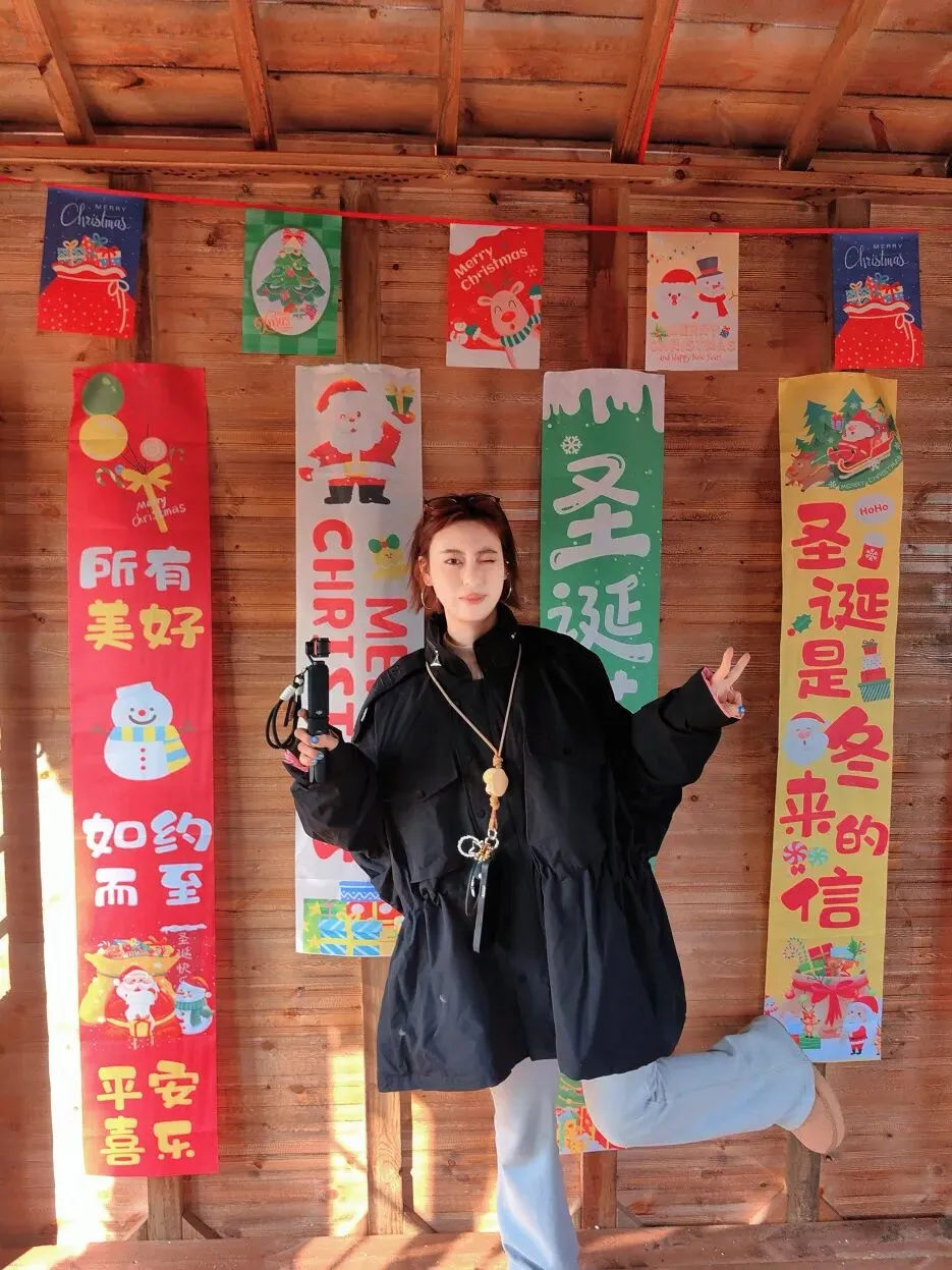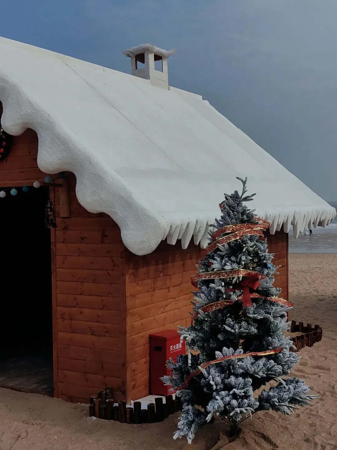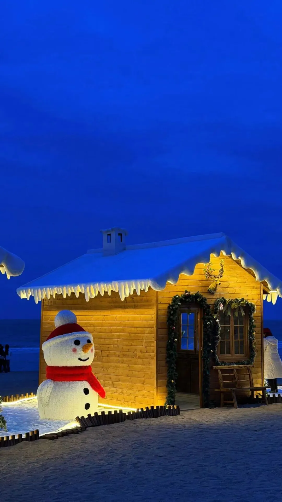 覆着仿真雪的屋顶垂挂着晶莹的冰棱,在阳光的照耀下折射出五彩的光芒。窗沿缠绕着绿松枝与金色蝴蝶结,增添了一份节日的氛围。