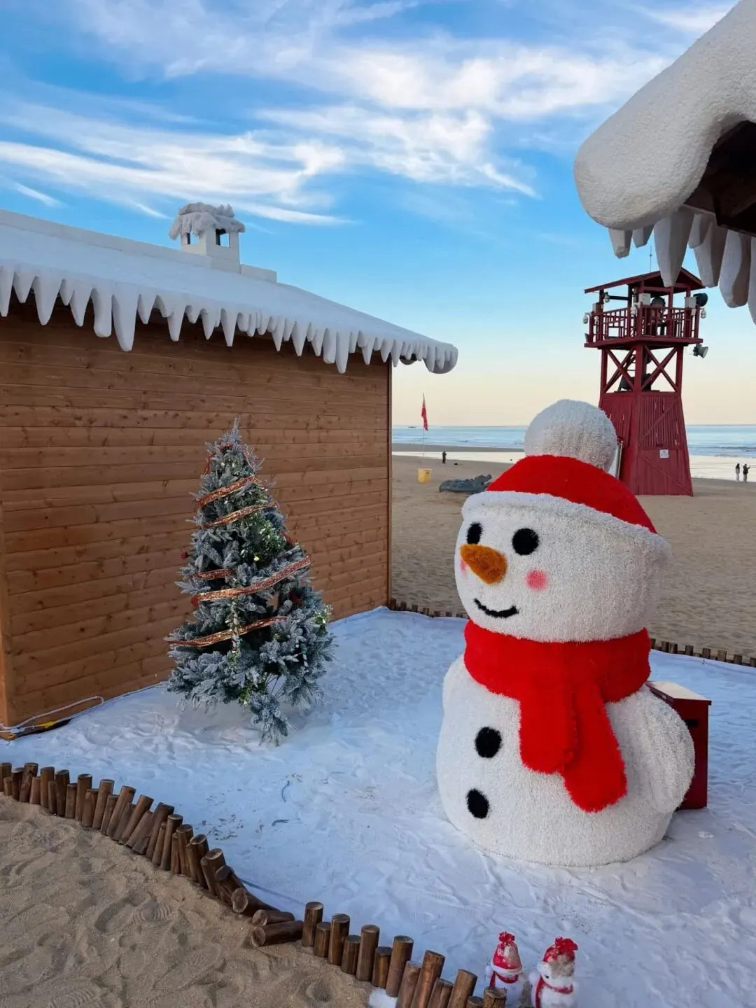 巨型雪人戴着红帽蓝围巾,憨态可掬地依偎在木屋旁,仿佛在欢迎着每一位游客的到来。
