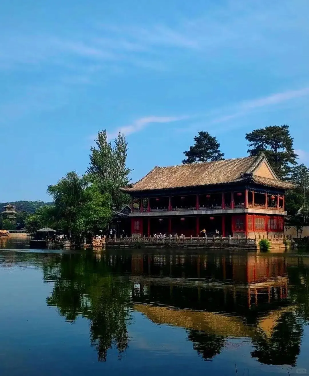 山庄里真比外面凉快几度.。湖.区像江南,平原区像蒙古,.山峦区像西.藏。.陪.爸.妈在“.烟雨楼”坐.会儿.,湖.水映着柳树。我爸说,.皇.帝可真.会找地方过.日.子。