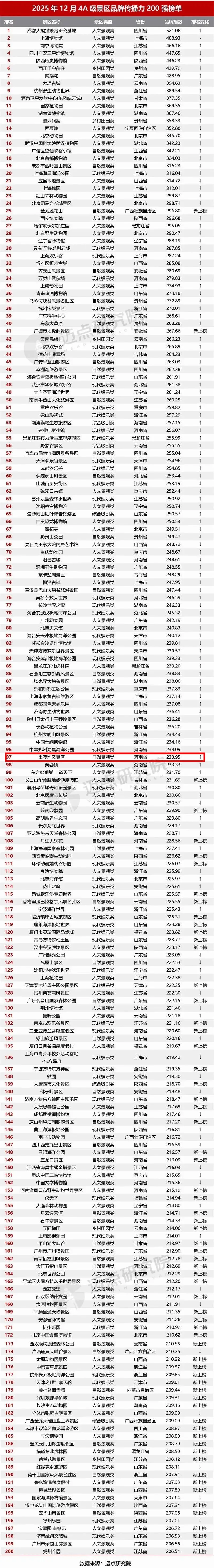 同期发布的4A级景区品牌传播力200强榜单中