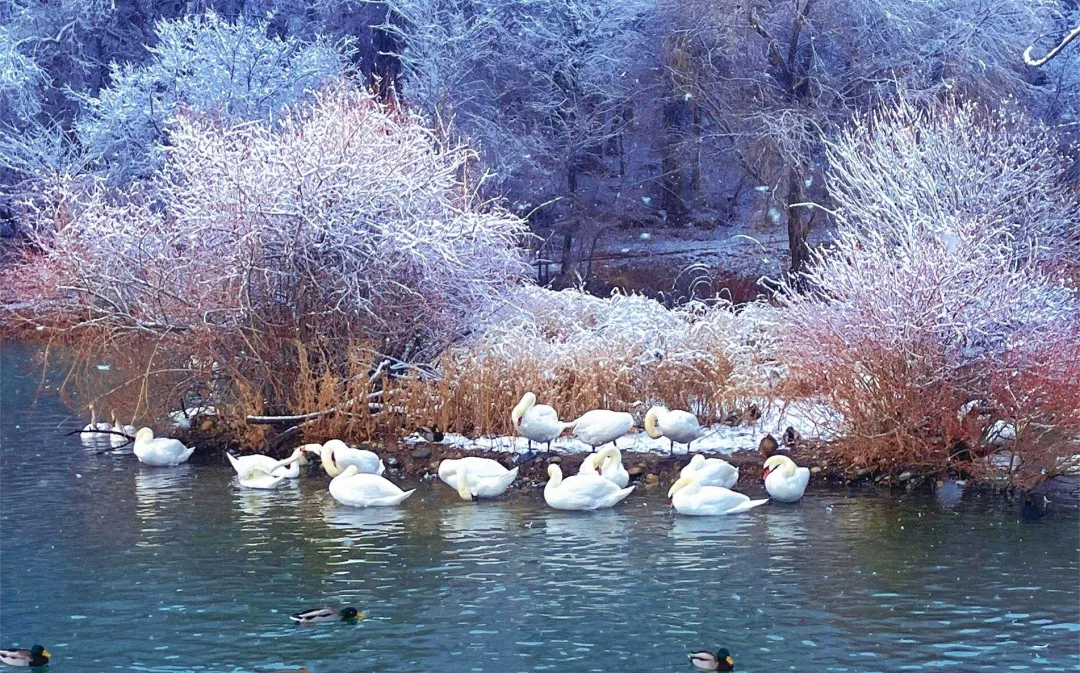 冬季的天鹅泉堪称摄影者的天堂。清晨6点,零下20℃的气温让湖面蒸腾起乳白色雾气,与岸边挂满冰晶的雾凇交织,宛如《红楼梦》中“琉璃世界白雪红梅”的意境。当第一缕阳光穿透云层,天鹅展开洁白的羽翼,在雾气中划出优雅的弧线,摄影师们称之为“天鹅的芭蕾”。冰层下的游鱼与水草清晰可见,偶尔可见野鸭破冰觅食,构成动静相宜的画面。 四月下旬,气温回升至0℃以上,湖面冰层逐渐融化。天鹅开始梳理羽毛,为迁徙做准备。此时湿地中芦苇新芽初绽,与残存的冰凌形成“绿丝线穿银珠”的独特景观。幼鸟跟随父母学习凫水,笨拙的身姿惹人怜爱,成为春日最动人的生态课堂。