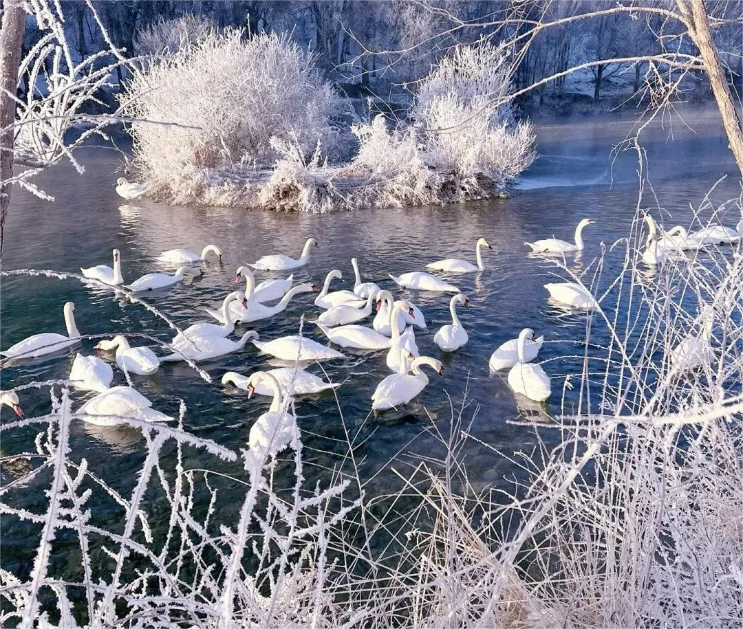 在中国西北边陲的新疆伊犁河谷,有一处被冰雪与雾凇笼罩的童话世界——天鹅泉景区。 这里不仅是疣鼻天鹅的越冬天堂,更是自然与人文交织的生态奇观。冬季的清晨,当阳光穿透薄雾,成群的天鹅在碧波上翩跹起舞,雾凇缀满枝头,仿佛置身于《冰雪奇缘》的魔法世界。