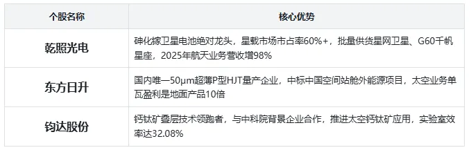 核心优势远超地面光伏:发电效率是地面的6-10倍,不受天气、季节影响,能实现全天候供电,未来还将支撑太空AI算力中心的能源需求,被视为光伏行业的“第二增长曲线”,市场规模预计达万亿级。