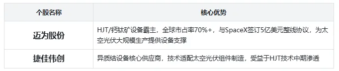 3. 设备制造:支撑太空光伏组件量产,核心需求来自HJT、钙钛矿整线设备,受益于产业扩产
