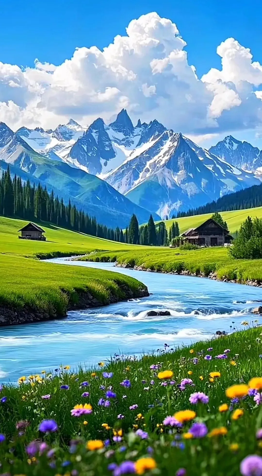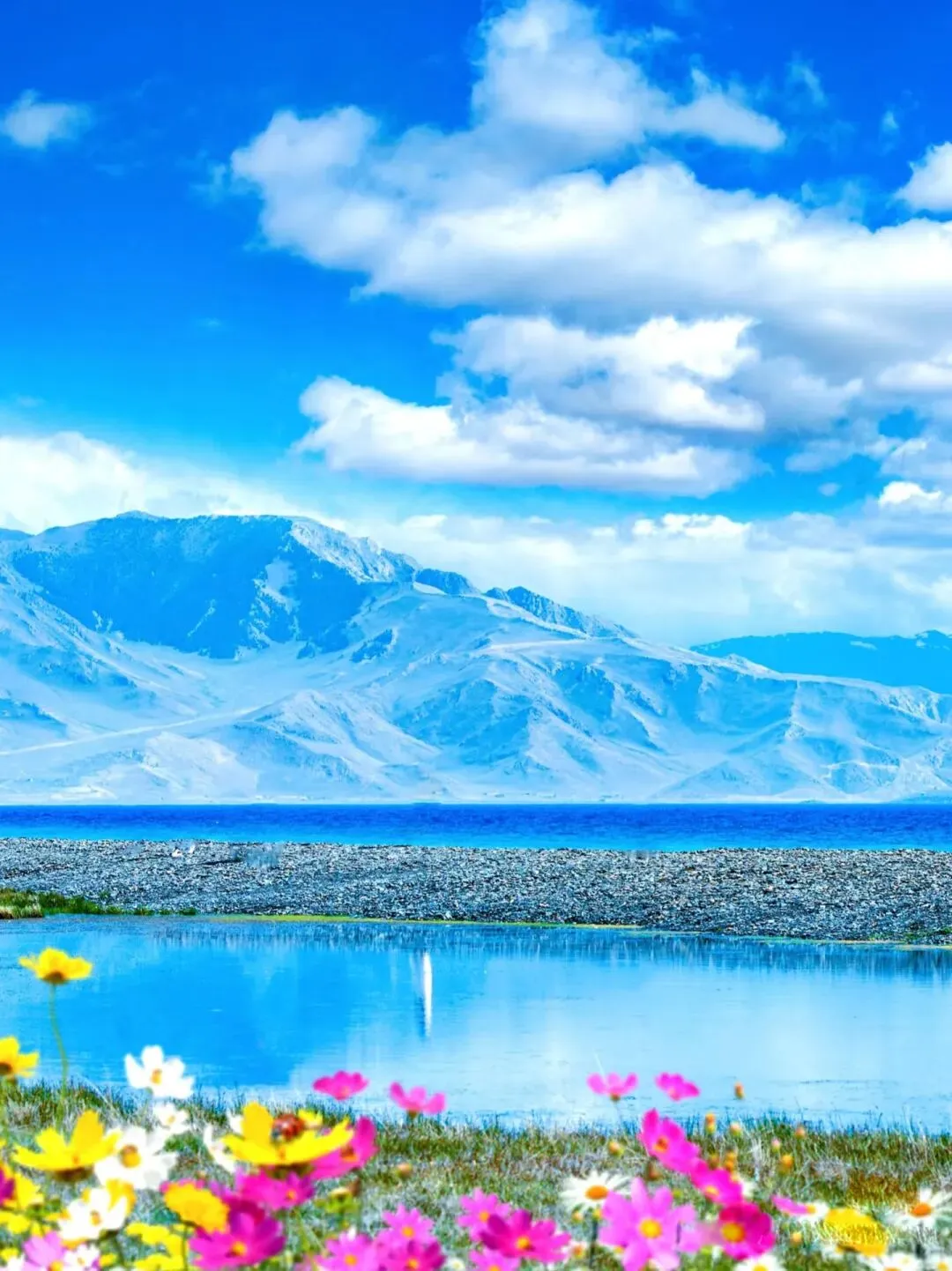 小花漫山遍野,蓝宝石般的湖泊,