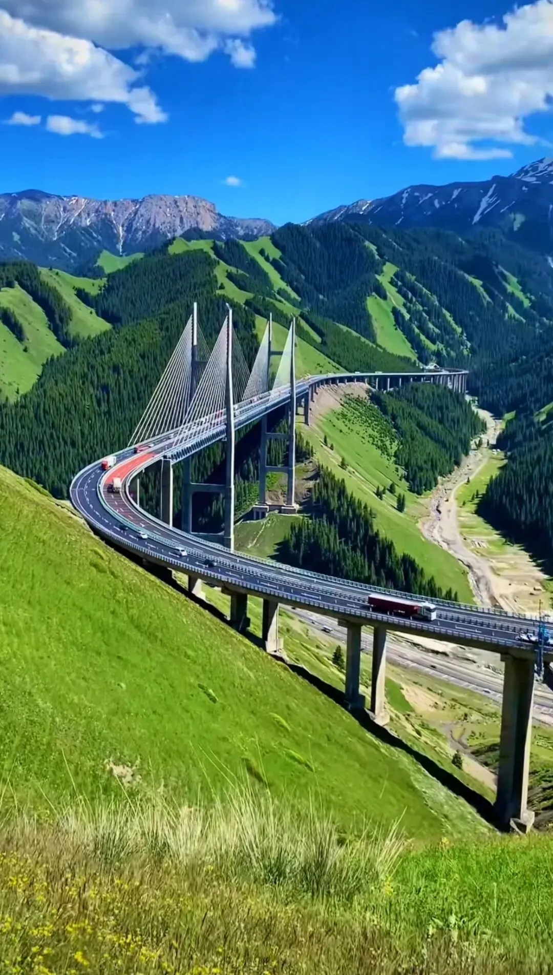 果子沟金顶可以俯瞰雄伟壮观的果子沟大桥,它像一条巨龙横跨在山间,与周围的雪景或美景相互映衬,格外壮观。
