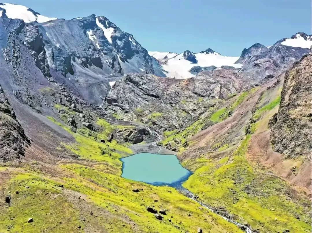 天湖湖水清澈碧绿,宛如一块碧玉镶嵌在雪山和草地之间。站在湖畔,可将周围的雪山、草原美景尽收眼底,还能拍摄到湖水倒映着蓝天白云和山峦的绝美画面,每一张都如同明信片般精致。