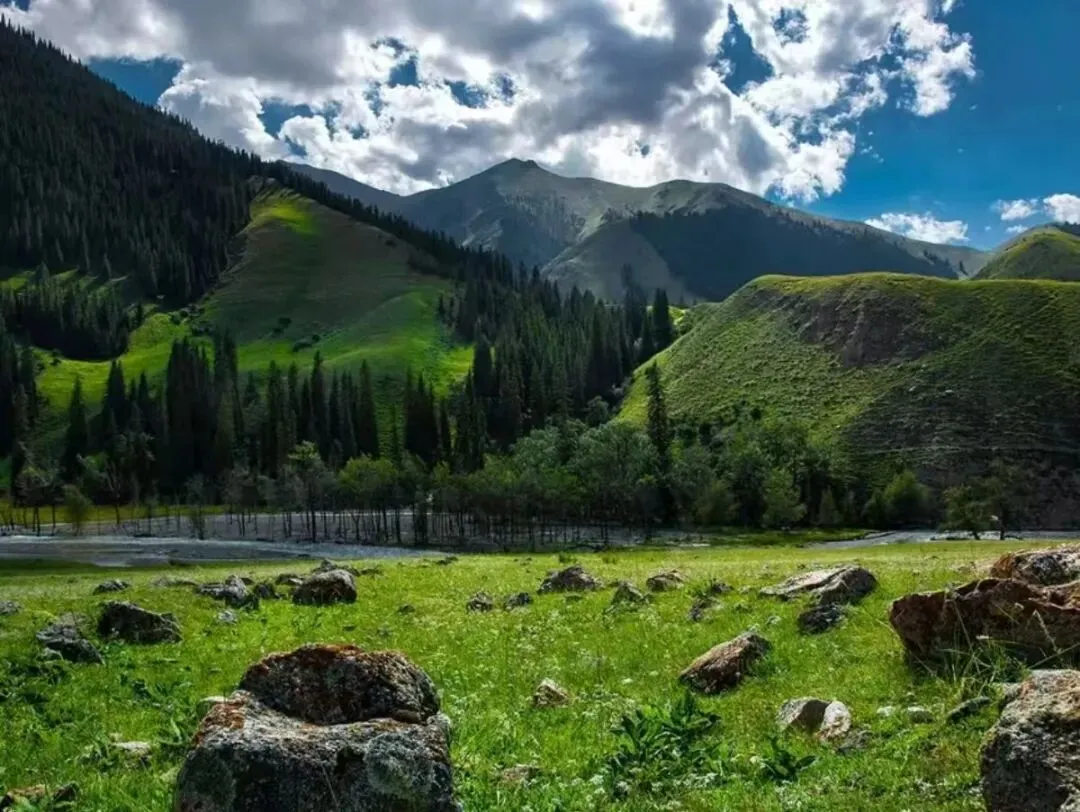 这里拥有令人陶醉的自然景观。地表平坦开阔,水分与气温恰到好处,四周被翠绿的群山环绕。山脚下,成片的胡杨林和野蔷薇随着季节变换色彩,春天绿意盎然,夏天繁花似锦,秋天五彩斑斓,冬天银装素裹。山顶是被赞誉为“上帝的牧场”的高山草甸,其间偶尔裸露的巨大岩石上刻着神秘的岩画,为这片土地增添了几分古朴与神秘。
