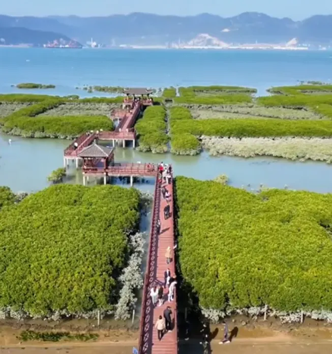 这里有一条红色的入海栈道,沿着栈道漫步,能感受海浪起伏,近距离接触这片 “海上森林”。整个红树林总面积有 1700 多亩,主要种植了秋茄、桐花树等品种,生态功能超强大。公园还配套了游客中心、风情商业街,能和周边景点串联成旅游线路,村里还有红色文化公园,有苏维埃政府、红军医院等革命旧址,既能赏景又能学历史。