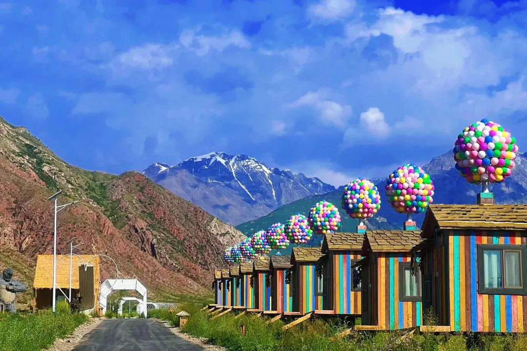 这里四面环山,背靠天山山脉的最高峰——托木尔峰,拥有冰川、雪山、森林、草原等各种优质自然资源,特别是村内丹霞地貌等独特风光,吸引着众多游客前来打卡。雪山与草原交织,自然景观十分优美,要登山远眺雪山和草原,蓝天白云、草原和雪山的组合会更好看。