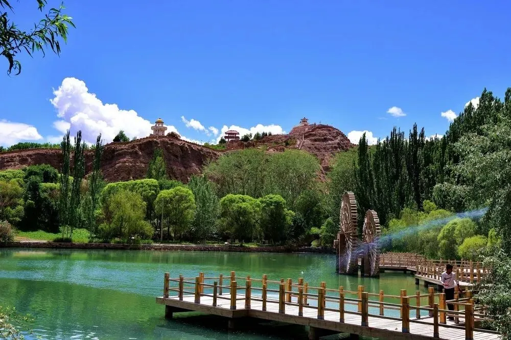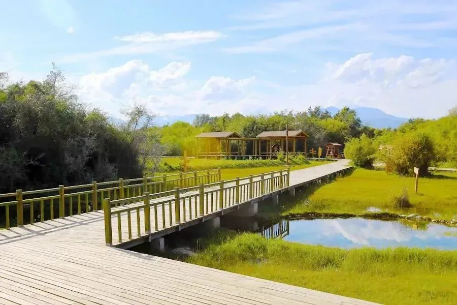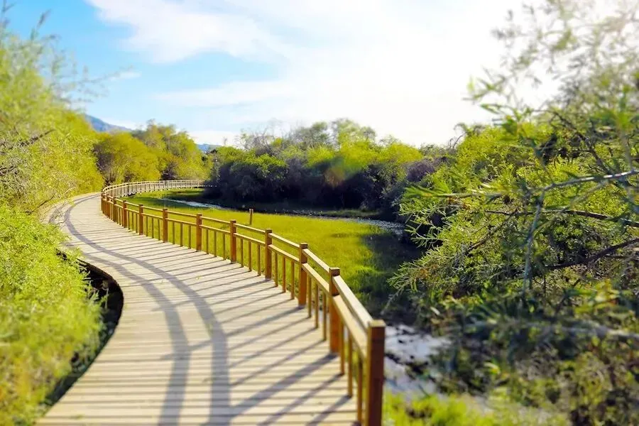 游客沿着人行木栈道前行,可观赏到溪流、泉水、沼泽、草地、养生长廊、瞭望塔、清心亭等主要景观。景区内不仅有野鸡、野鸭、野兔等保护动物,还有野生沙棘、胡杨、蔷薇、红柳等植物。夏天花草茂盛、绿意盎然,秋天熟透的沙棘果映红整个树丛,清澈的泉水横贯林地,叮咚作响。