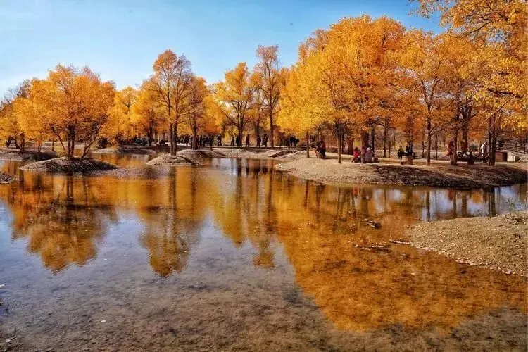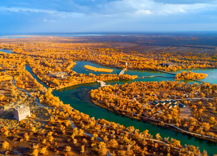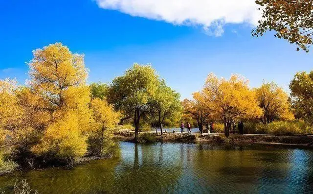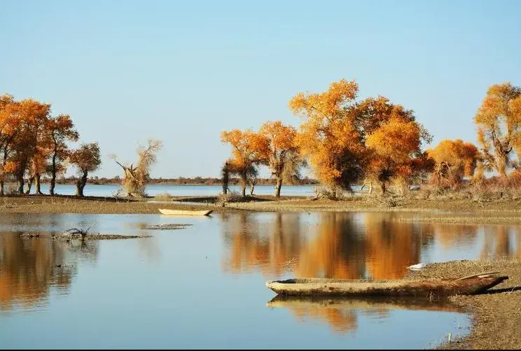 这里地理环境集湿地、沙漠、绿洲于一体。胡杨林生长茂盛,还有“水上胡杨林”的美称。金秋十月,是欣赏胡杨最好的季节,在阳光的照射下,层林尽染的金黄胡杨搭配湖上倒影,宛如一幅幅天然的彩色画卷,是摄影拍照的好地方。
