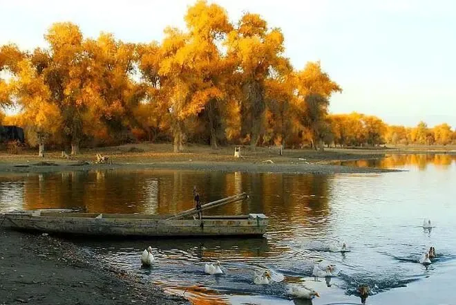 沙雁洲位于阿克苏沙雅县塔里木河南岸的盖孜库木乡盖孜库木村,地处塔克拉玛干沙漠北缘,是阿克苏地区沙雅县生态旅游景区的中心地带,总面积约42平方公里。它是沙雅县世界胡杨林公园的一个最重要的核心景区,也是一个集湿地胡杨、戈壁胡杨、沙漠胡杨和水胡杨为一体的胡杨、塔河、湖泊(水库)、湿地、水鸟、农耕、游牧、野生动物等综合人文景观度假旅游区。