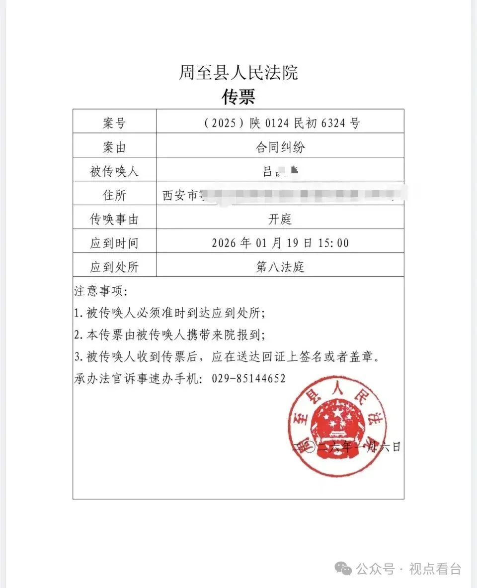 周至县人民法院传票显示,该案于2026年1月19日在周至县人民法院开庭审理。吕先生称,庭审中景区负责人承认存在工作错误,同意退还门票款,但因财务流程要求,需待判决书出具后执行。
