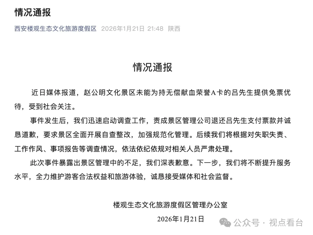 1月21日晚,西安楼观生态文化旅游度假区官方微信公众号发布情况通报:赵公明文化景区未能为持无偿献血荣誉A卡的吕先生提供免票优待,责成景区管理公司退还吕先生支付票款并诚恳道歉,同时将依法依纪依规对相关人员严肃处理。