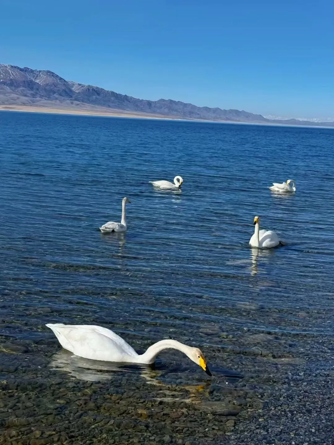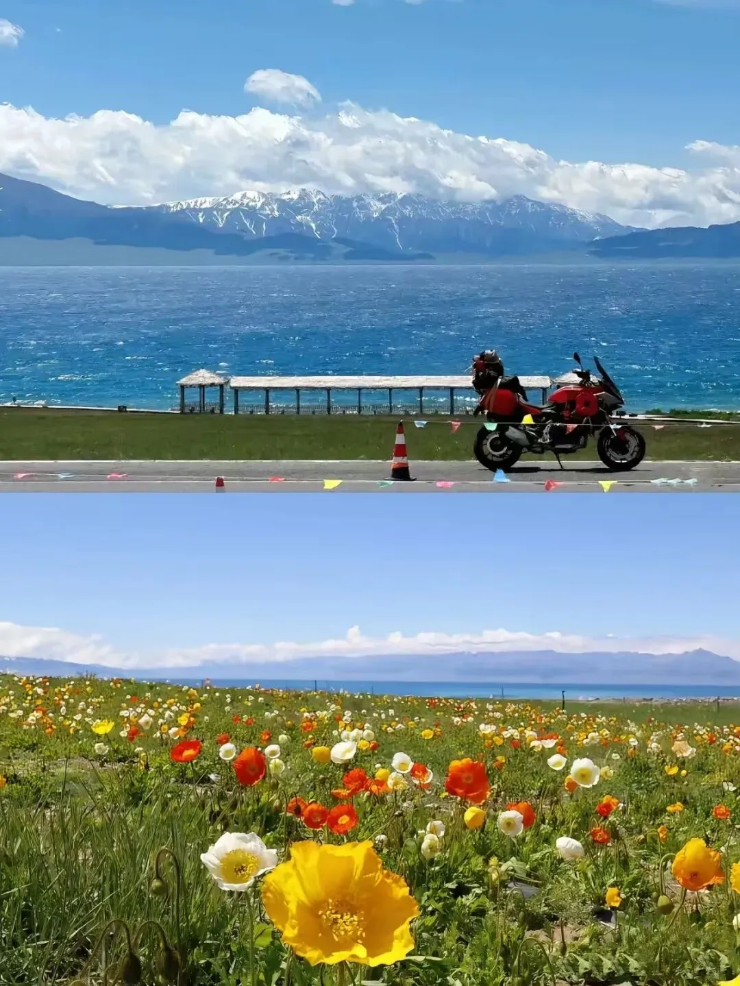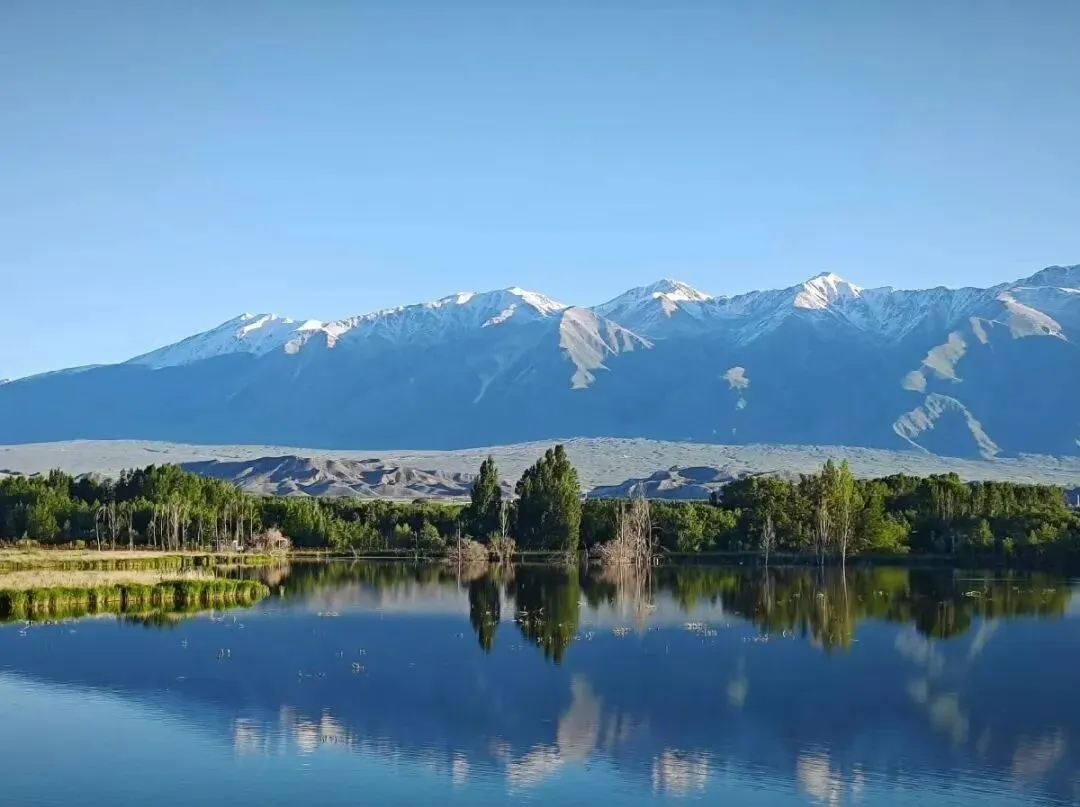 背靠雪山,湖边是广阔的草原,湖水清澈蔚蓝,因风景绝美一直是新疆最著名的几大景点之一。终年不化的雪山主要位于西侧,从湖东区域拍照视角较好,可以拍到雪山下面有湖水的美景。
