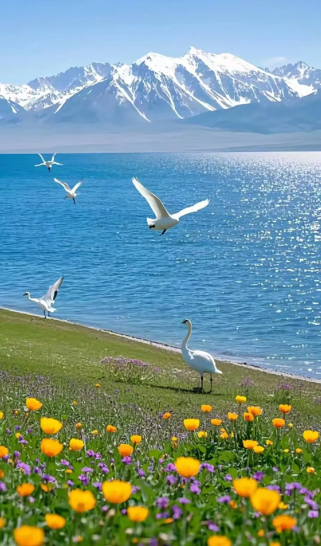 赛里木湖被誉为“大西洋最后一滴眼泪”,湖水清澈湛蓝,四周雪山环绕,春夏之际湖畔野花盛开,秋冬时节冰封湖面如镜。这里是摄影爱好者的天堂,也是徒步和露营的绝佳之地。
