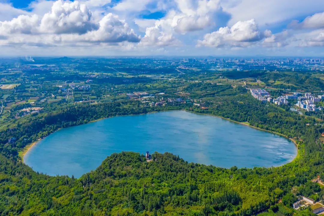 湛江市湖光岩风景区以第四纪火山喷发而形成的罕见、典型的玛珥火山地质遗迹及其优良的自然生态环境而著称,形成于14万-16万年前,主要由双火山口湖与火山岩垣组成。景区内有玛珥湖、湖光岩组地层剖面、高密度负氧离子区、楞严寺等20多处自然景观与人文景观。