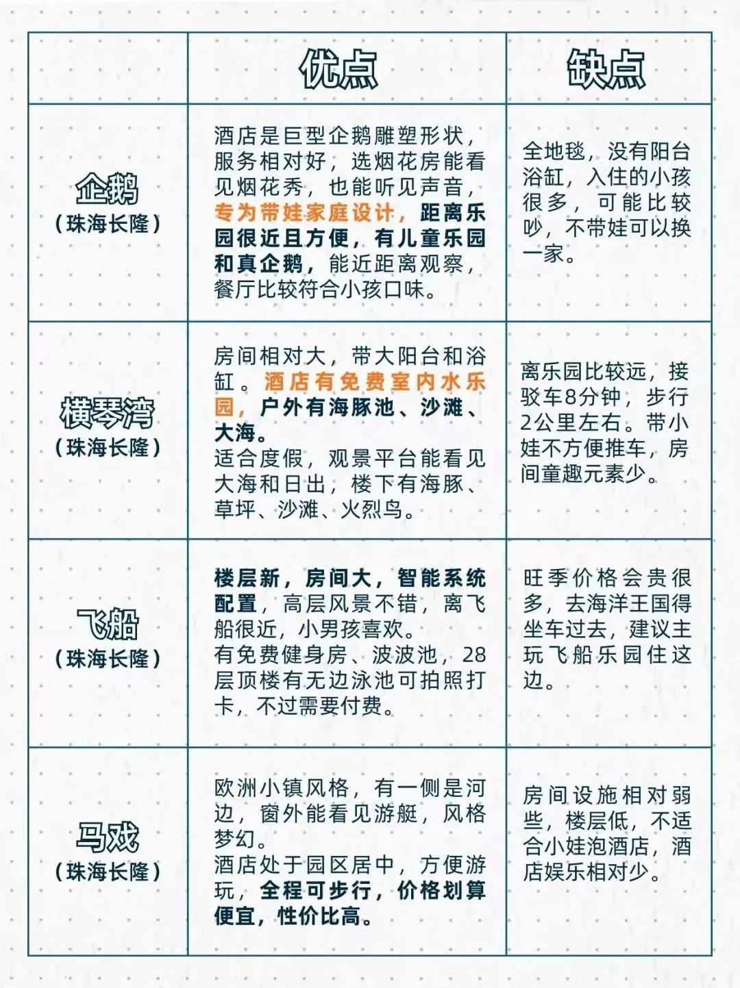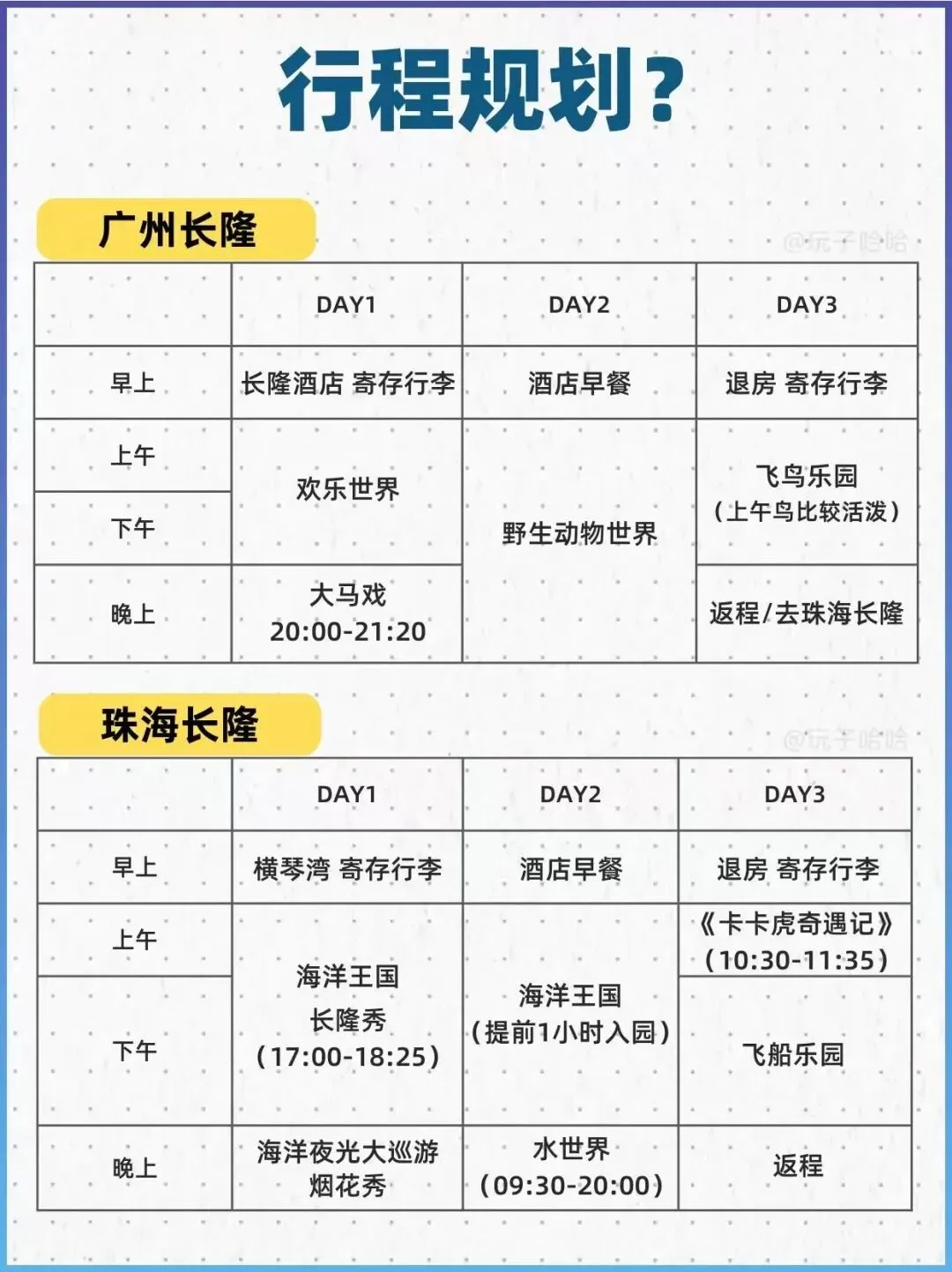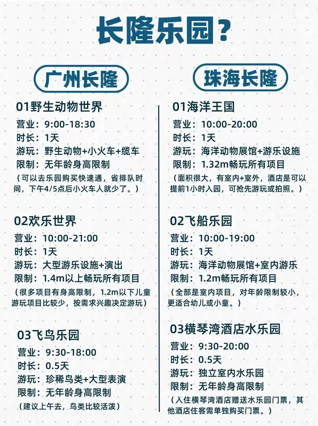 长隆旅游攻略0124💰广州长隆>珠海长隆 广州:野生动物园(重点)、欢乐世界、飞鸟乐园 珠海:海洋王国(重点)、飞船乐园 💚广州长隆:分成四个独立园区,每个园区有不同项目,但水乐园夏季才开。 💙珠海长隆:分成两个独立园区,其中海洋王国面积很大,是综合性的乐园,里面含海洋动物展+大型游乐园,相当于融合一起了。 💚广州长隆:乐园分布较散,除了欢乐世界在园区内,其他乐园要做接驳车,往返之间会麻烦一些。 💙珠海长隆:乐园之间挨着,而且乐园旁边的酒店离得很近,带小娃确实方便很多,步行都能到。 广州:长隆酒店、熊猫酒店、香江酒店 珠海:企鹅酒店、横琴湾、马戏酒店、飞船酒店 💚广州长隆 ✔️特色:长隆酒店47㎡起,园区客房面积最大,餐厅有白虎和火烈鸟,能近距离观察互动。 ✔️划算:香江酒店,园区外围,离动物园很近,套票比较划算,只是接驳车少一些,也可以打车。 ✔️可选:带小娃娃选熊猫或长隆,大娃选香江。 💙珠海长隆 ✔️特色:企鹅酒店,亲子首选,有烟花房能看见海洋王国烟花秀,餐厅还有企鹅,可近距离观察。 ✔️划算:马戏酒店,不但处于园区中心,而且套票很划算,就是酒店娱乐比较少。 ✔️可选:带小娃娃选企鹅酒店,大娃选马戏酒店。 广州长隆>珠海长隆 💚广州:位于市区周边,商场和餐饮选择性比较多,开车出去吃饭或去其他景点方便。 💙珠海:靠近海边,周边山峰和公园比较多,餐饮商场选择少,去澳门或港珠澳大桥比较近。 #珠海长隆#广州长隆#珠海长隆企鹅酒店#广州长隆熊猫酒店#长隆攻略