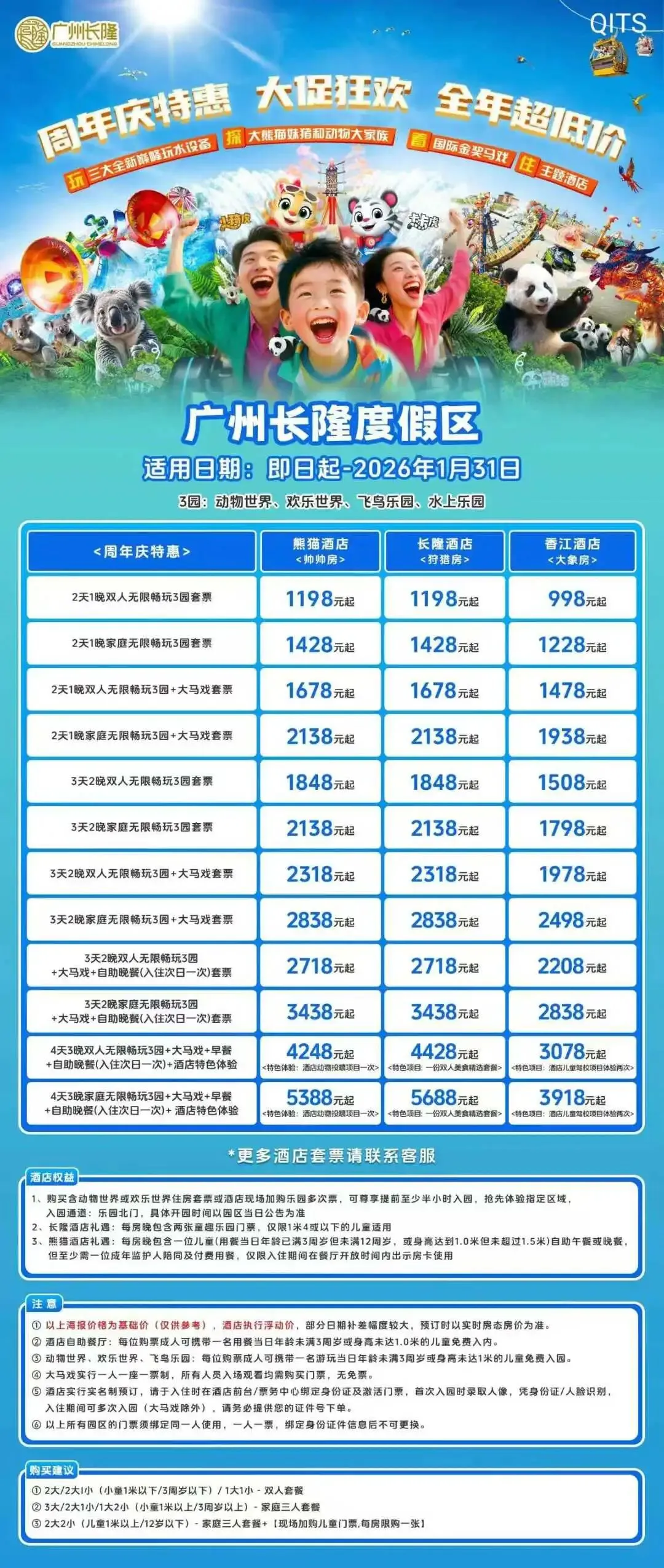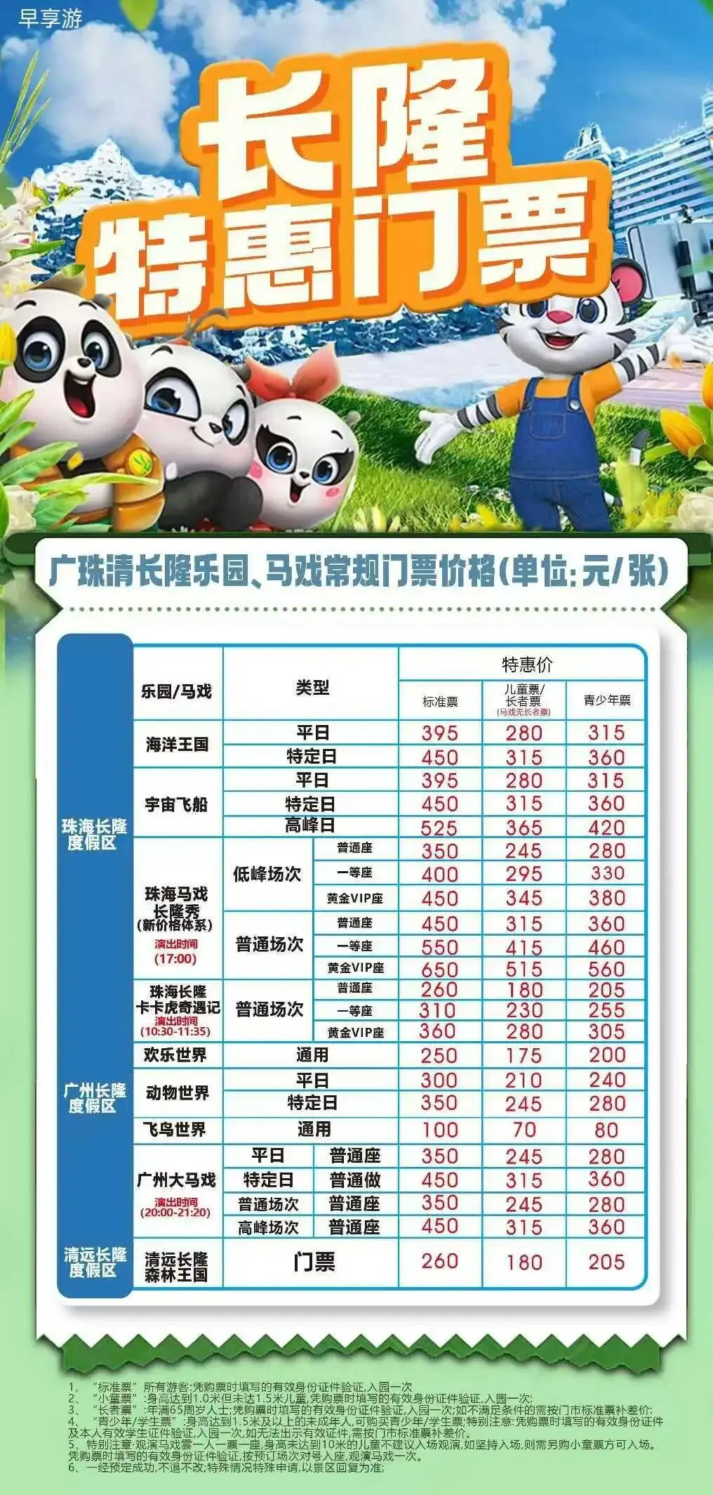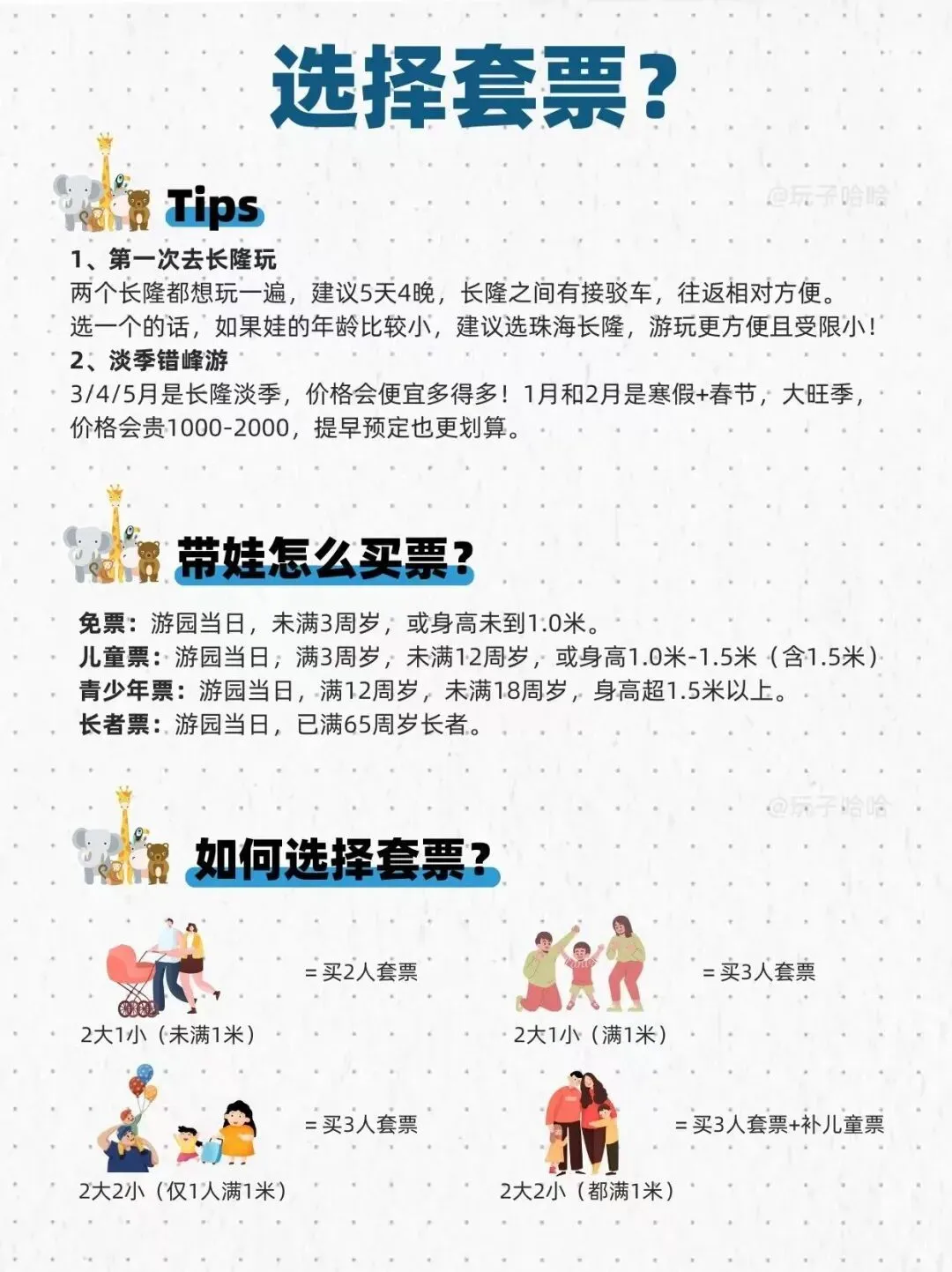 两个长隆都是含酒店的套票,广州长隆比珠海长隆贵些。广州1晚或2晚都是“畅玩三园”,但珠海1晚的是“单园”,2晚是“双园”。 淡季3月/4月/5月可能有赠早餐或升房活动,春节和寒暑假比较贵,价格变动大,建议提前买。