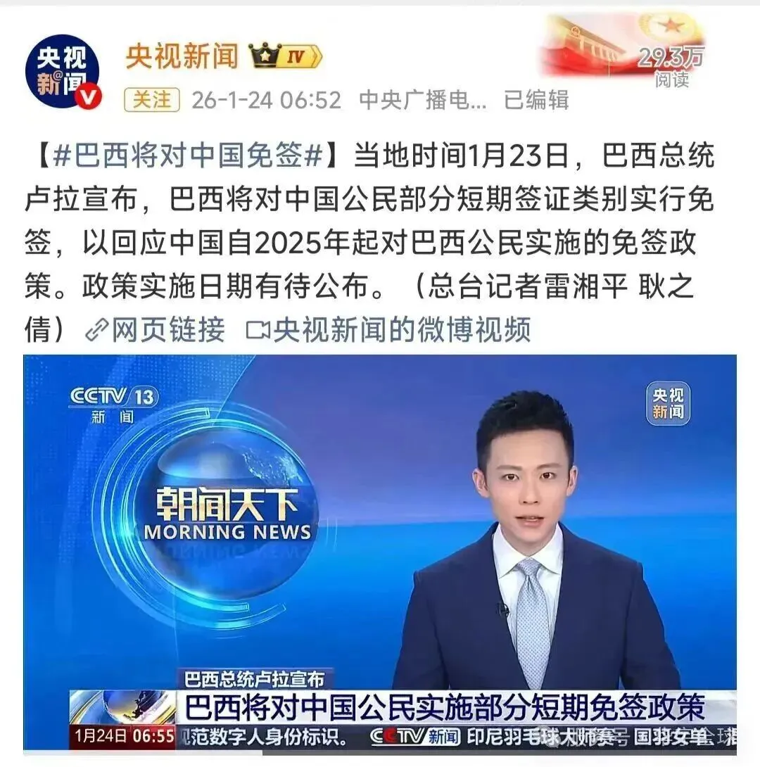 一、免签政策细则 老胡致电了旅游局,根据巴西方面公布的初步信息,此次免签政策将允许持有有效中国护照的游客或商务人士,无需提前申请签证即可入境巴西,停留期限为90天,适用于旅游或短期商务活动。政策计划在不久的将来正式生效。(目前具体细节还没出) 巴西时间1月23日9:08(中国时间1月23日20:08),据巴西总统府官网的新闻稿:巴西总统确认将免除中国短期签证部分类别,具体细则待后续公布。 值得留意的是,巴西目前尚未提供更多关于政策实施时间、延期申请、出入境具体要求等执行细节。出行前务必通过官方渠道核实最新信息。