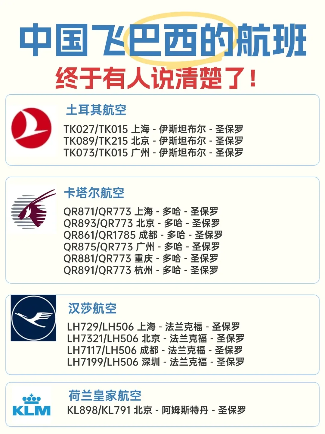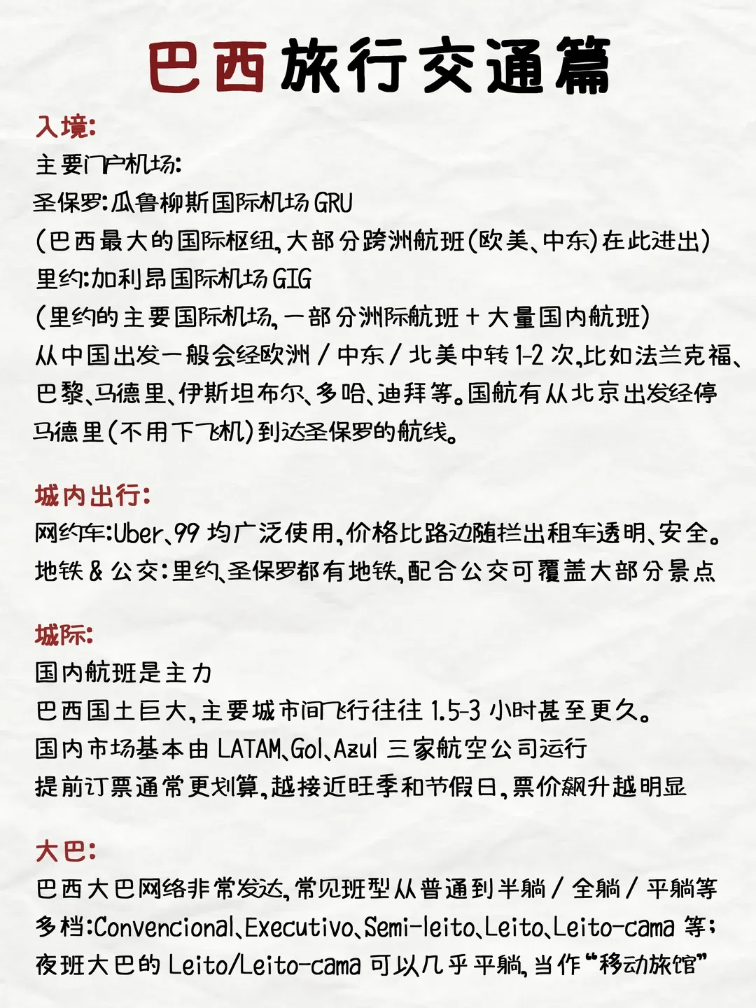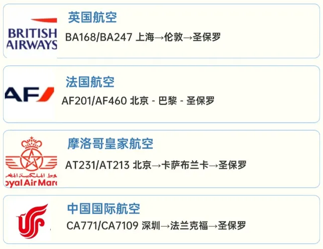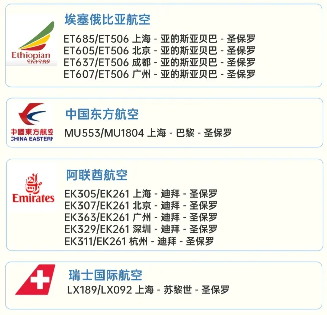 三、 机票、酒店与当地交通 免签之后,出行便利性大增。面对遥远的距离,如何规划行程成为关键。 国际航班(老胡可一手代理出票,比网上各大平台都有优势 ) 目前中国与巴西之间尚无直飞航班,主要中转枢纽包括: 中东:多哈(卡塔尔航空)、迪拜(阿联酋航空)、阿布扎比(阿联酋航空/埃蒂哈德航空)。航线网络发达,服务优质,是中转的热门选择。 欧洲:巴黎(法国航空)、法兰克福(汉莎航空)、伊斯坦布尔(土耳其航空)等。欧洲航司也提供丰富的南美航线。 美国:达拉斯、休斯顿、迈阿密等(美国航空、联合航空等)。需提前办理美国过境签 非洲:亚的斯亚贝巴(埃塞俄比亚航空),是极具性价比的选择。 机票价格随季节波动很大,南半球的夏季(12月至次年3月)是旅游旺季,机票价格较高。建议至少提前3-4个月关注票价,利用比价平台寻找合适选择。