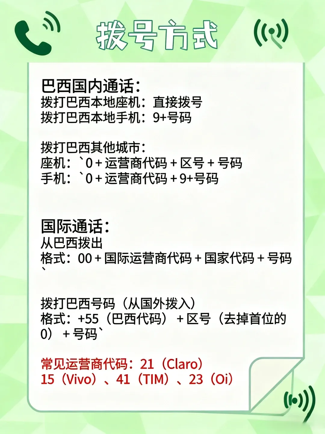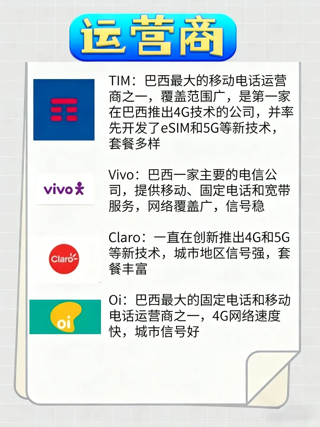 网络与通讯 机场和主要酒店通常提供Wi-Fi。购买当地运营商的预付费SIM卡是获得移动网络经济实惠的选择,巴西主要运营商有Vivo、Claro、TIM等。