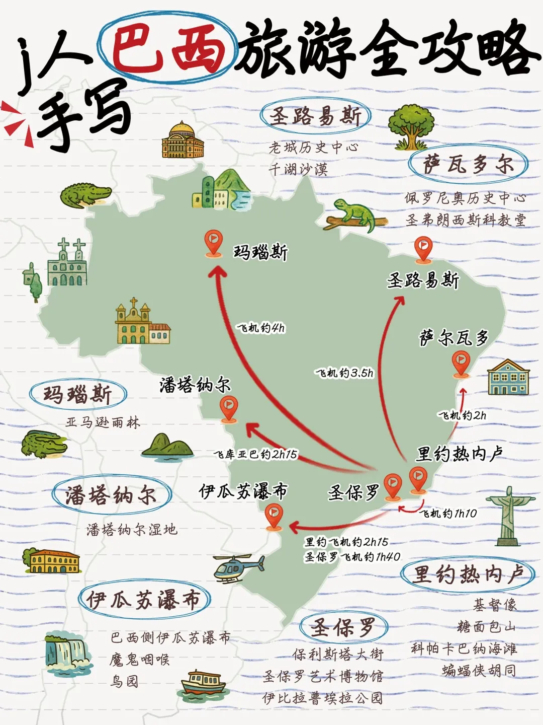 国内交通 巴西国土面积世界第五,跨越多个时区,国内飞行是连接主要旅游城市最高效的方式。戈尔航空、 LATAM巴西航空等提供密集的国内航线网络。提前预订通常能获得不错的价格。