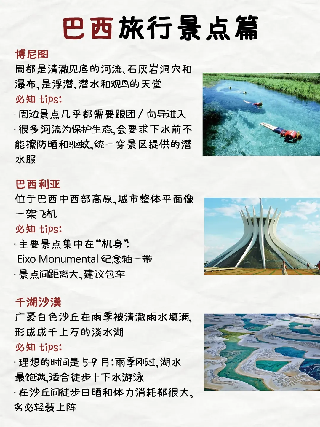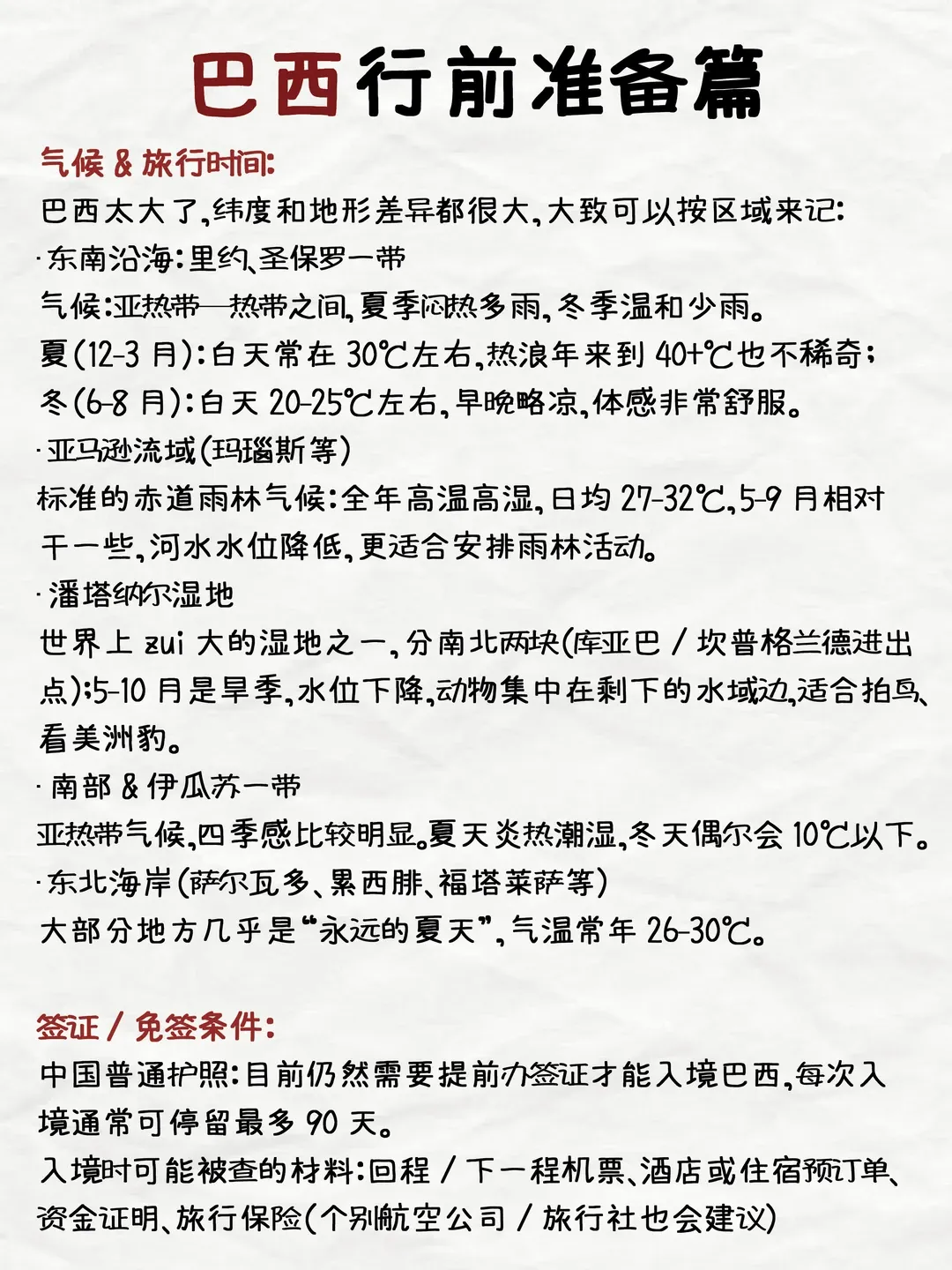 旅行季节 巴西地处南半球,季节与北半球相反。 最佳旅行时间:总体而言,5月至9月(干季)是大多数地区的最佳旅行时间,降雨较少,适宜户外活动。 狂欢节:每年2月或3月的狂欢节期间是旅游超级旺季,里约热内卢的庆典举世闻名,但需提前很久预订一切资源,且价格高昂。 亚马孙地区:7月至11月是水位较高的时期,更适合乘船深入雨林;12月至次年6月水位较低,徒步活动更多。
