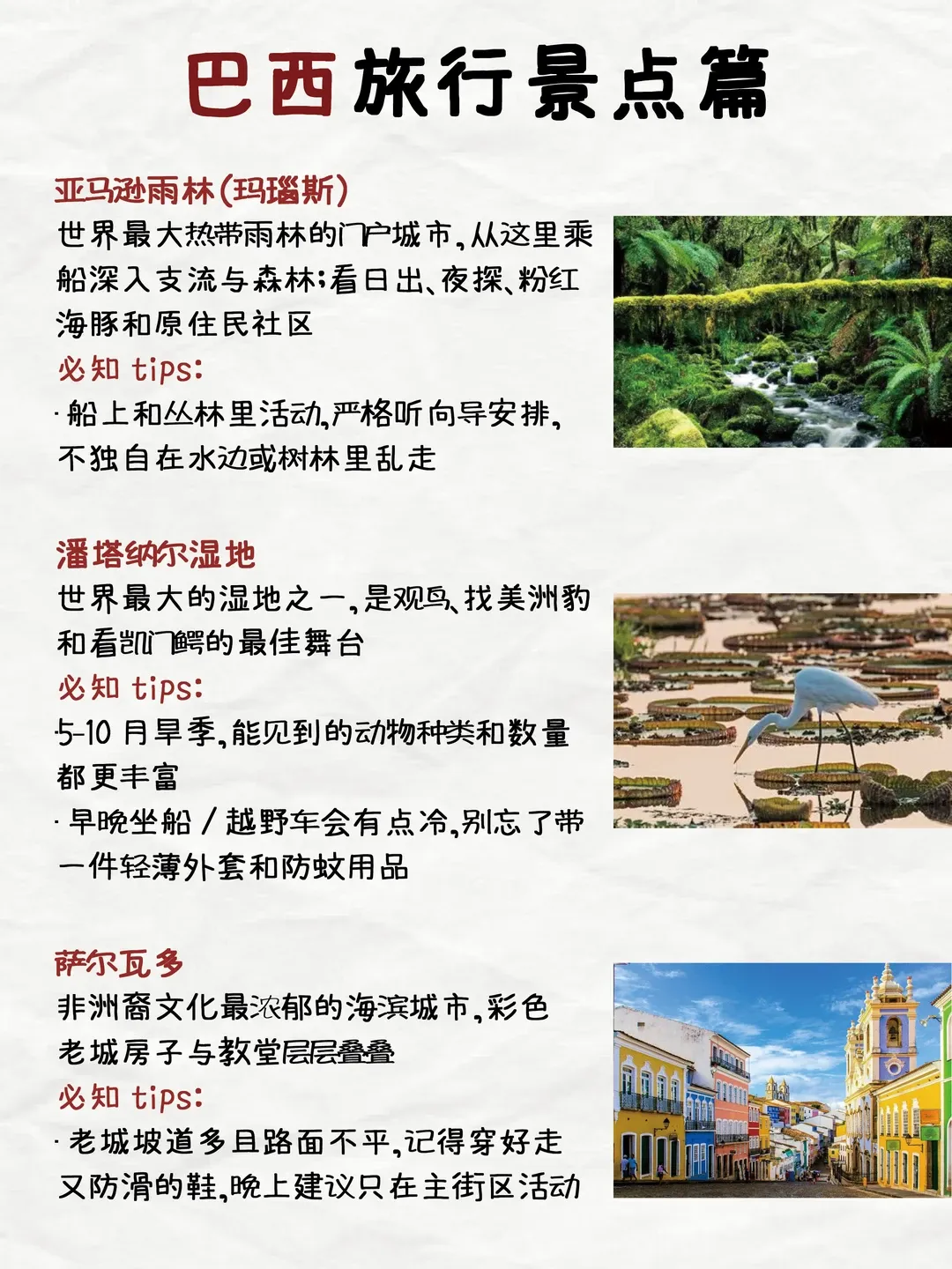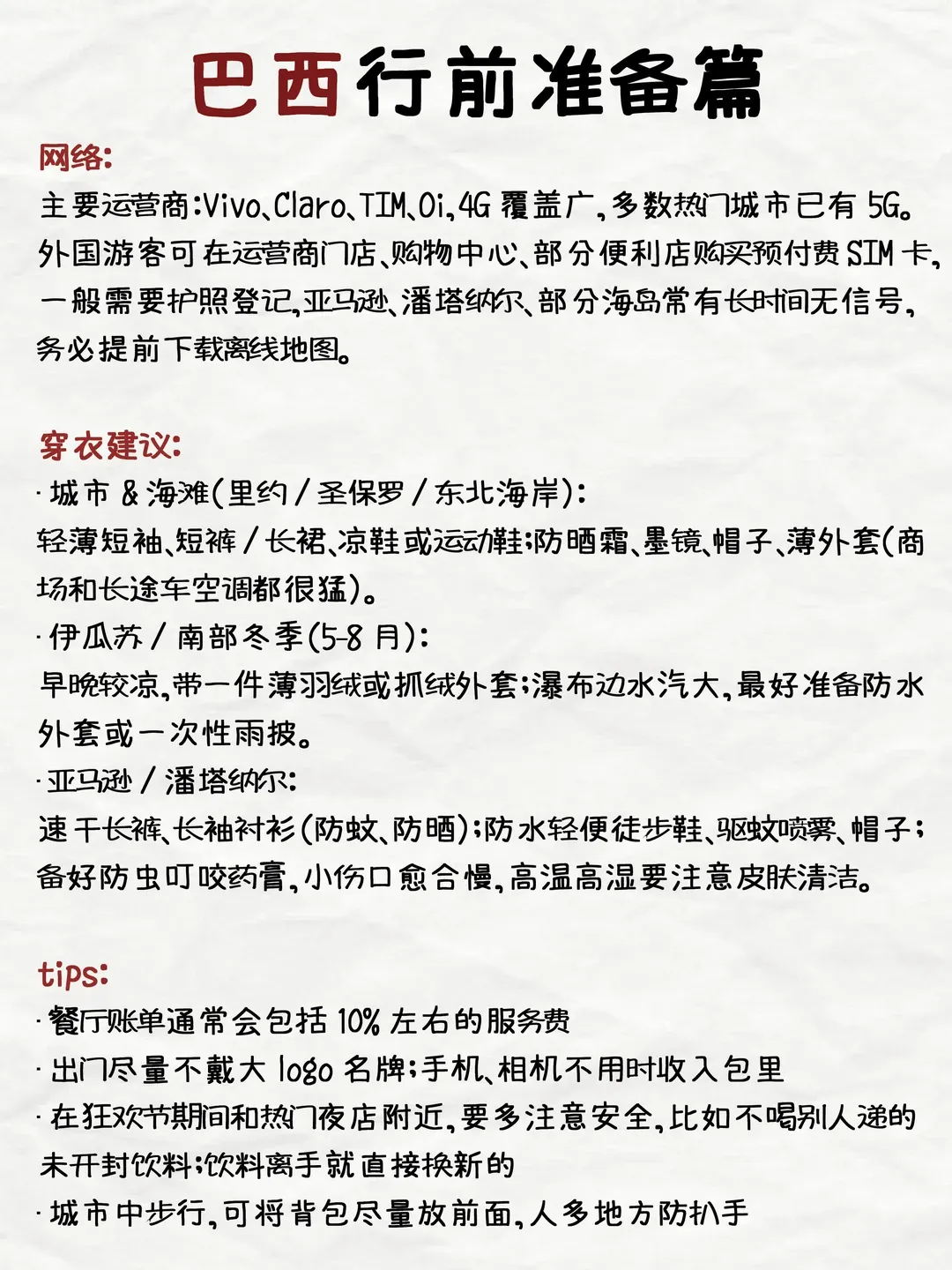 四、 实用旅行注意事项 踏上巴西土地前,了解以下信息能让旅程更加顺畅安全。 安全与健康 城市治安:巴西主要大城市某些区域治安问题较为突出。务必保持警惕,避免夜间单独出行,勿在公共场所显露贵重物品,尽量使用银行卡而非大量现金。咨询酒店前台了解安全区域。 疫苗接种:前往亚马孙地区,建议提前接种黄热病疫苗,并携带国际预防接种证书。部分其他地区也可能有建议接种要求,行前请查询最新健康建议。 医疗保险:强烈建议购买覆盖全面、包含医疗转运的高额旅行医疗保险。