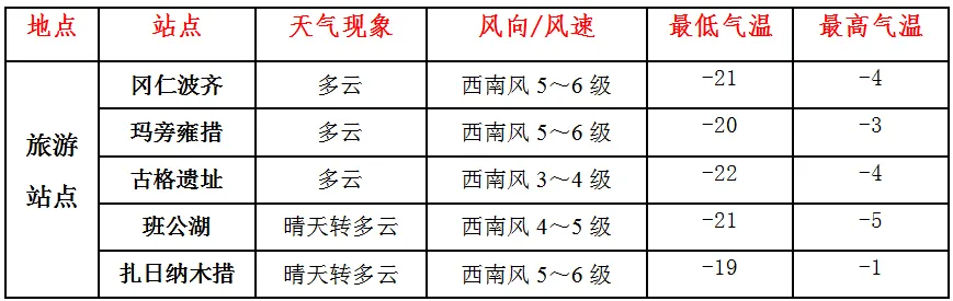 未来24小时阿里地区主要交通、旅游站点天气预报