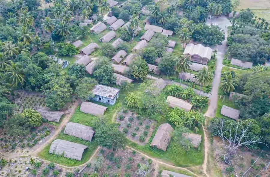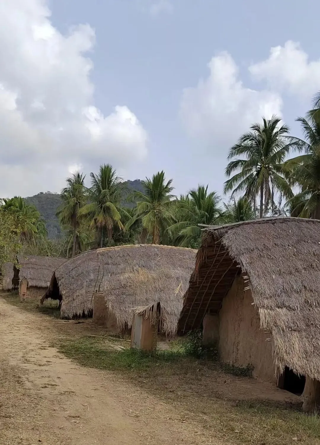 这些船型屋全部用茅草和竹木搭建,外形像倒扣的小船,茅檐低矮,墙体用黄泥混合稻草涂抹,既通风又防潮,是黎族先民适应热带气候的智慧结晶。走进村子,脚下是青石板路,两旁是错落有致的船型屋,房前屋后种着槟榔树、椰子树,偶尔能看到穿着黎族传统服饰的老人坐在门口织黎锦,画面古朴而宁静。