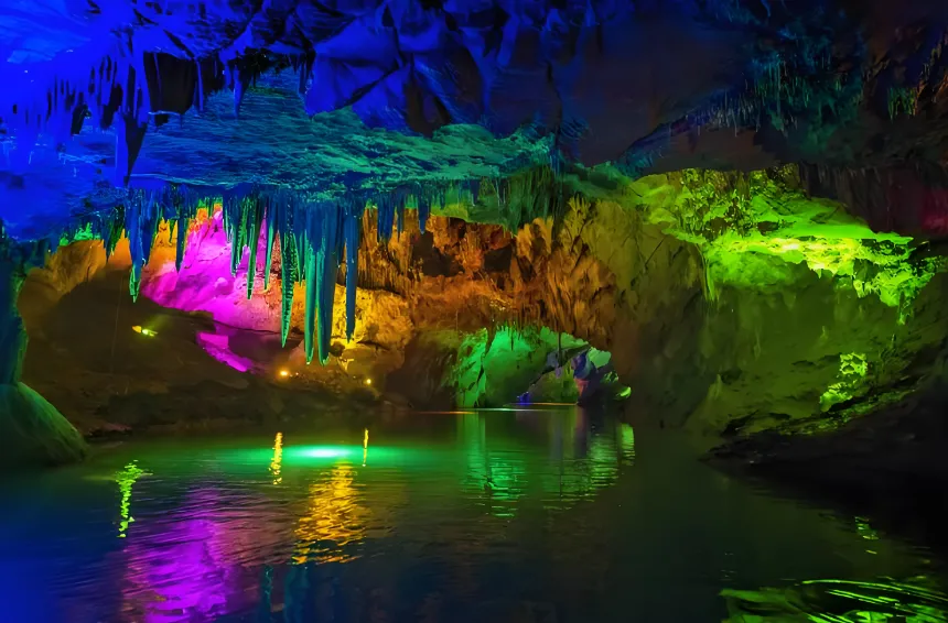 第一站:本溪水洞景区——钻进地球的“银河水道”听我一句劝,来本溪不去水洞等于没来!这可是国家5A级景区,被《国家地理》评为“中国最美旅游洞穴”。它不是那种干巴巴的旱洞,而是一条全长5800米的地下暗河,咱们能坐船游3000米。洞里恒温12℃,夏天进去得穿外套,冬天反而觉得暖和。最绝的是“银河飞瀑”,灯光一打,钟乳石像冰柱子似的垂下来,跟仙境一样。别信门口卖额外船票的,门票里都含着呢!