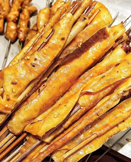 第三美食:老林烤豆皮——5块钱的快乐这可是本溪的网红小吃,5块钱10串。酱汁是酸甜口的,豆皮烤得焦香,刷上秘制酱料,吃完还得舔手指。在小市或者市区的夜市都能买到,边走边吃特接地气。