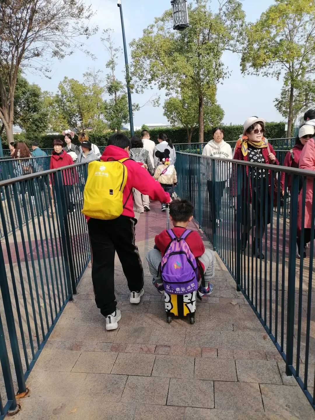 出发当天,在浦东机场下飞机后用手机软件打车,直奔迪士尼,路程大概50分钟,如果坐地铁时间太久。汽车开到迪士尼的停车场,我们下车后按照指示往里走,在进入迪士尼大门前有好多人招呼寄存行李和儿童推车,告诉我行李箱不让带进去,在他那里寄存40元,如果到检票口寄存价格会更高是80元。因为游客须知内容每没有说不让带,行李的规定,于是不太相信这些人说的话,就没有寄存,继续往前走,进入大门时,工作人员也没有拦我的行李,心想,这不是让带进来了嘛😄于是沿着迪士尼大道跟着人群往前走,大概走了300米,看到了有唐老鸭的星愿公园,沿着公园边上的路继续前行,又走了大概200米,终于进入检票口前的排队栏杆入口。