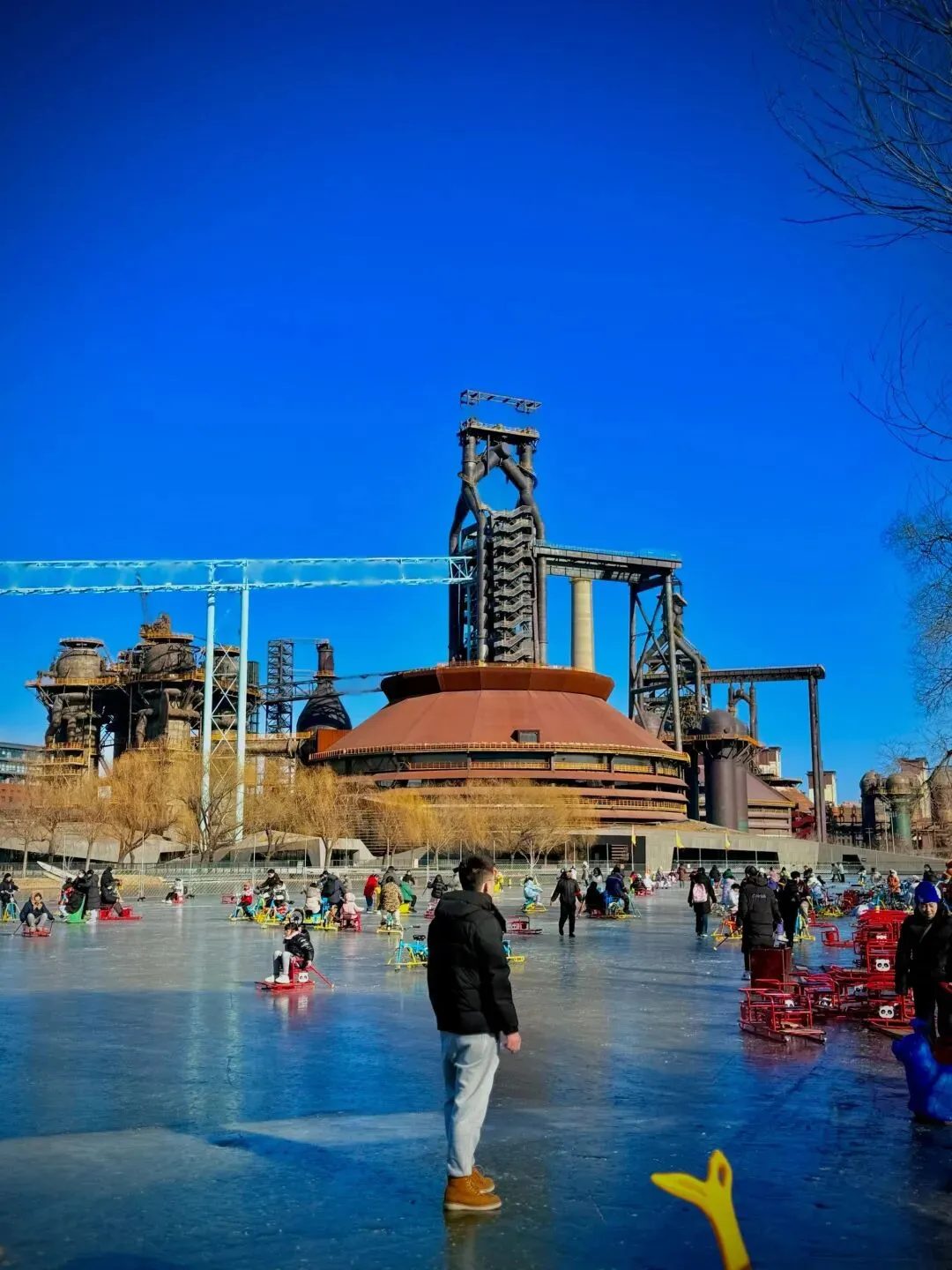 “秀冰场”:3万㎡冰面毗邻三高炉,夜场开放至21:00,冰面倒映红色钢架与冬奥之环,如科幻电影场景
