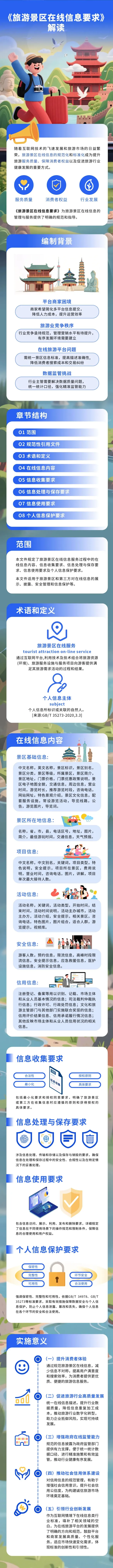 《旅游景区在线信息要求》规定了旅游景区在线信息服务过程中的在线信息内容、信息收集要求、信息处理与保存要求、信息使用要求及个人信息保护要求,适用于旅游景区和第三方对在线信息的展示、披露、安全管理和信息保护等。