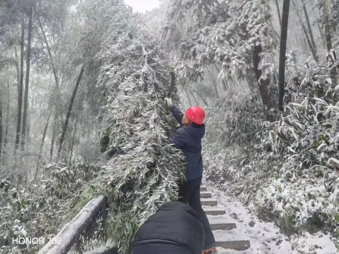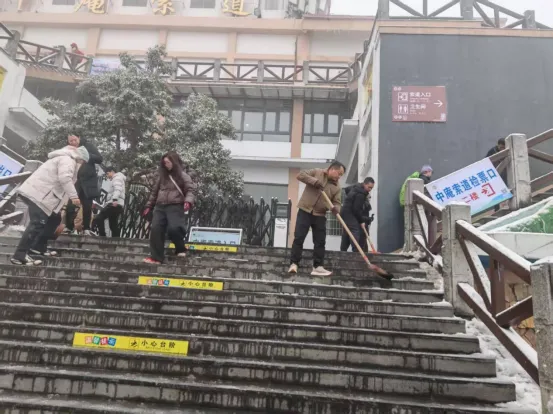 以雪为令,景区工作人员迅速行动。为避免积雪结冰影响游客通行,保洁人员手持铁锹、扫帚等工具,对主要道路、游步道展开清雪除冰作业。在石鼓寺、中庵等游客集中区域,他们分工明确,有的铲雪,有的清理雪水,24小时保障景区卫生,为游客开辟安全通道。