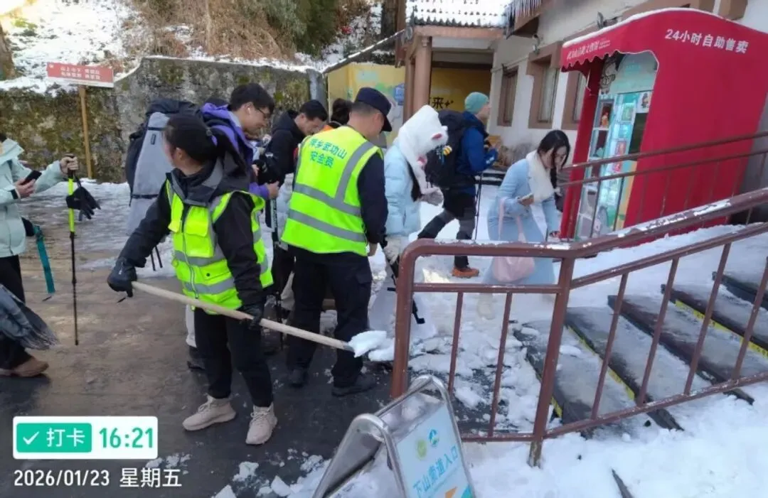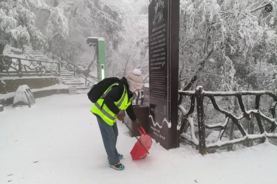 精准发力,筑牢双重保障防线。此次降雪给保洁工作带来了极大挑战。景区结合高山气候特点,科学划分保洁责任区,对易结冰的台阶路段、坡度较大的游客步道实行“双人搭档、轮班值守”制度,确保积雪及时清理、垃圾动态清零。