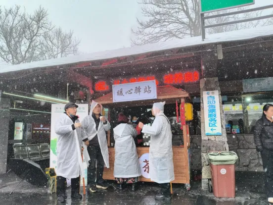 暖心联动,彰显景区责任担当。保洁人员一边加紧清扫路面冰雪确保通行安全,一边在服务点备好暖意融融的热姜茶,主动递给过往游客御寒。这一杯杯热茶,驱散了旅途的寒意,也传递出景区服务的人情味和责任担当,让游客在冰雪天地间感受到格外温暖。