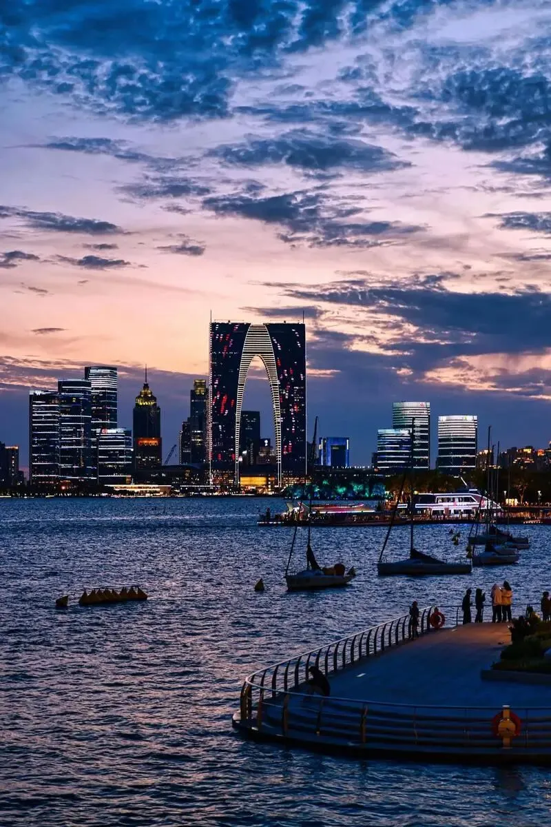 东方之门雄伟壮观;苏州中心造型流畅,如一条跃动的鲤鱼;音乐喷泉在夜幕下随律动舞动,色彩斑斓。李公堤夜景尤其迷人,这里融合餐饮、娱乐、观光游玩,超级适合闲逛。