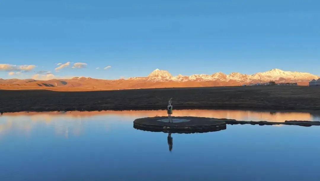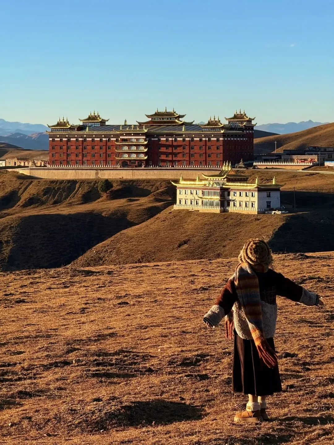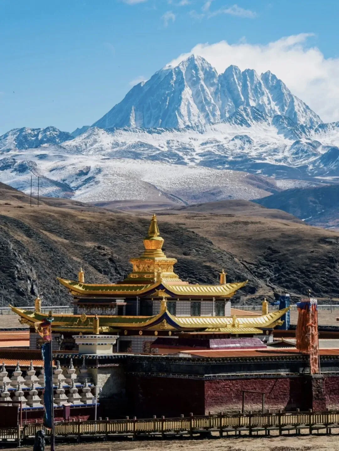 冬日的塔公草原,广袤又宁静,薄雪轻覆的草甸泛着素净的白,与亚拉雪山的冷冽银峰遥遥相衬;木雅大寺的金顶在晴光里愈发醒目,暖黄光泽落在雪地上,晕开柔和的光斑。